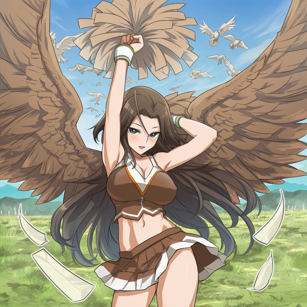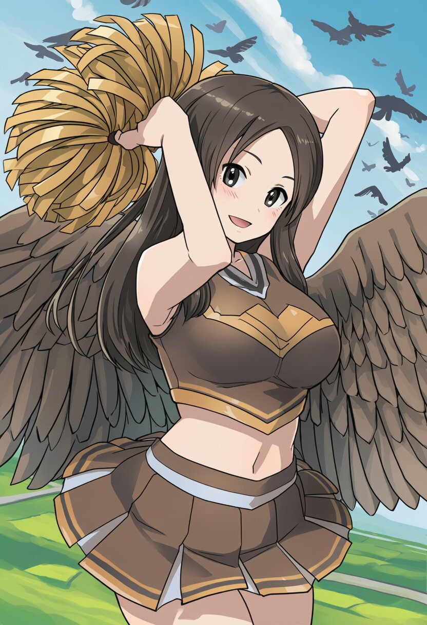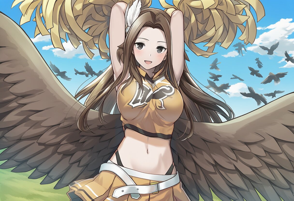 {{{highly detailed}}}, {{official style}}, {{game cg}}, {{intricate}}, {{nyanko daisensou}}, {{slender}}, 1girl, solo, black eyes, long hair, {{{{straight hair}}}}, brown hair, forehead, large breasts, light smile, {{{{brown wings, eagle wings}}}}, light smile, blush, open mouth, navel, {{{cheerleader}}}, {{wearing brown cheerleader costume}}, {{{hold a pompon}}}, {{{arms up}}}, cowboy shot, blue sky, grasslands, {{{flock of eagles}}}, no humans, {{{masterpiece}}}, {{{best quality}}}, {{{very aesthetic}}}, {{{ultra-detailed}}}, {illustration}, {{{extremely detailed}}}, {{{an extremely delicate and beautiful}}}