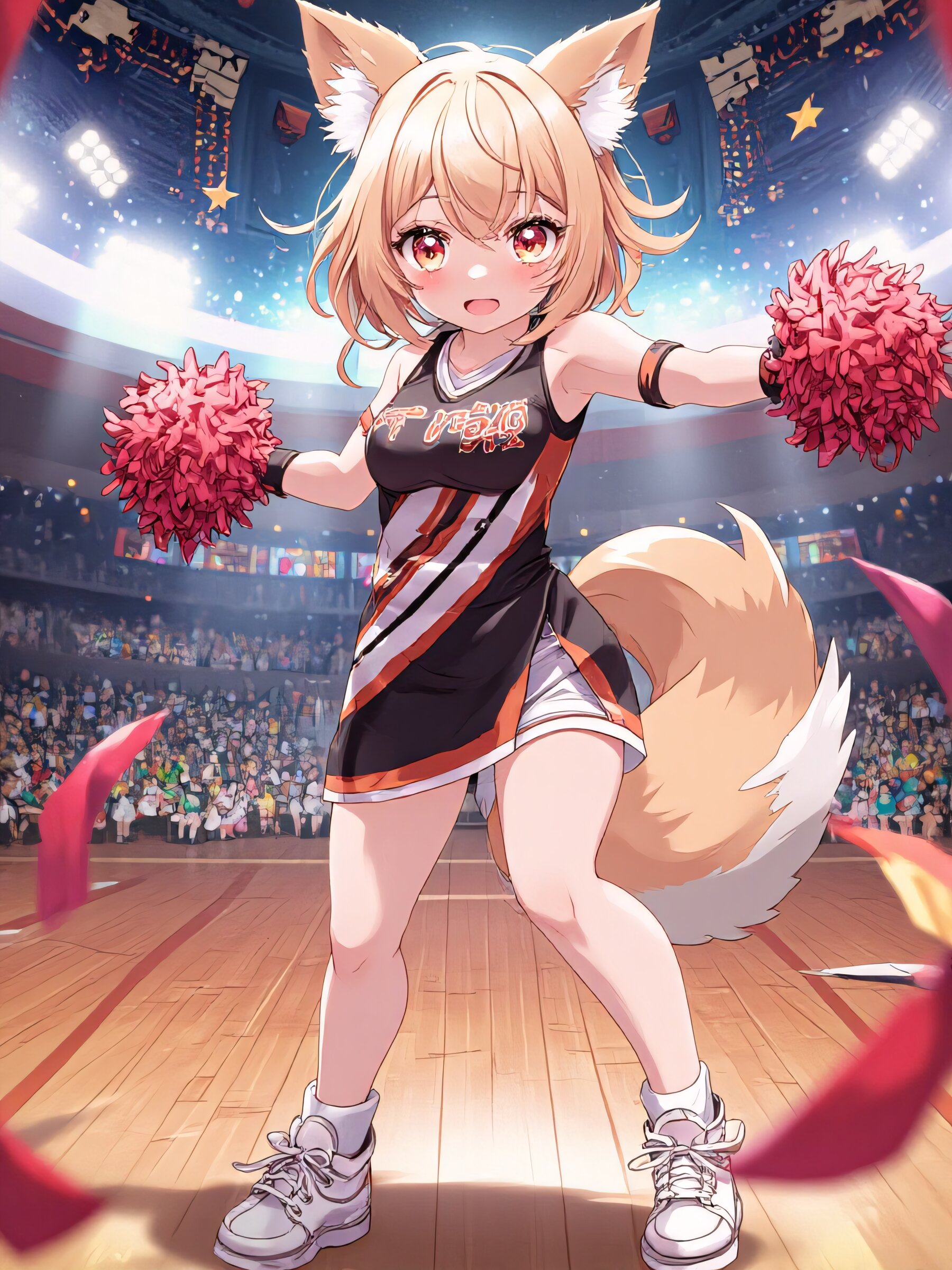 Anime style, full-body, fox-eared girl, light brown hair, fluffy fox tail, double eyelids, long eyelashes, large red eyes, Friday cheerleader outfit, holding pom-poms, energetic pose, lively gymnasium setting, wooden floor reflections, bright stadium lights, dynamic atmosphere, vibrant colors, enthusiastic spirit, cheerful expression, movement, excitement, action-packed scene.