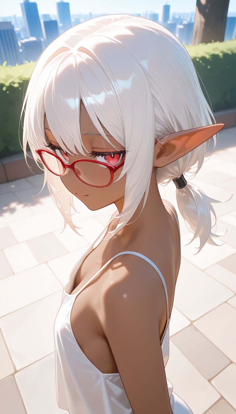 1woman, sensitive, (beautiful eyes, detailed eyes), from above, from side, looking at viewer, cute, cityscape, park, outdoors, day, upper body, (dark skin, red-framed eyewear:1.2), white hair, low ponytail, medium hair, flat chest, elf, red eyes, white camisole, downblouse, standing, walking, no bra, light smile, jitome, masterpiece, best quality, amazing quality,