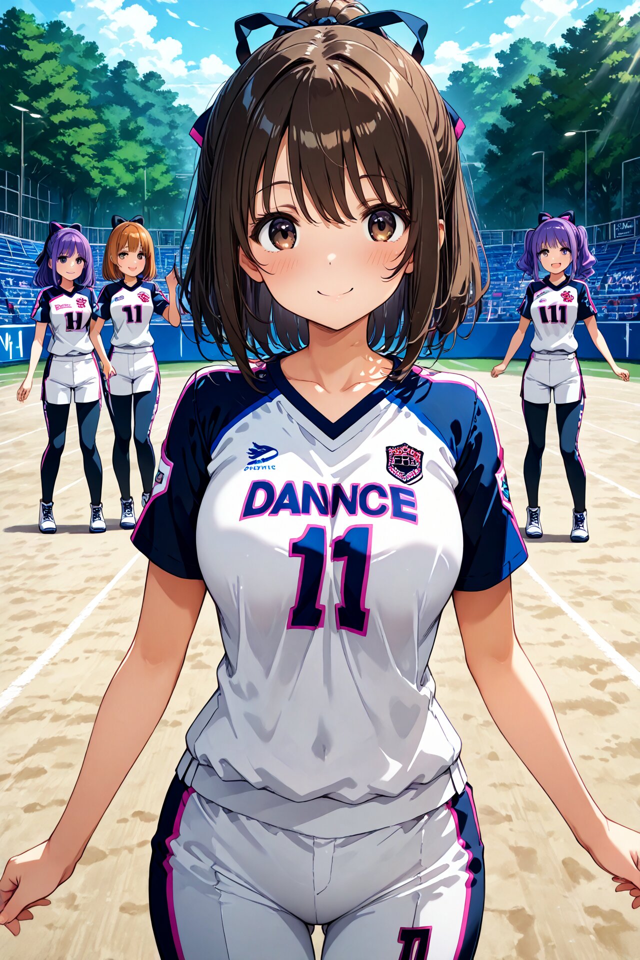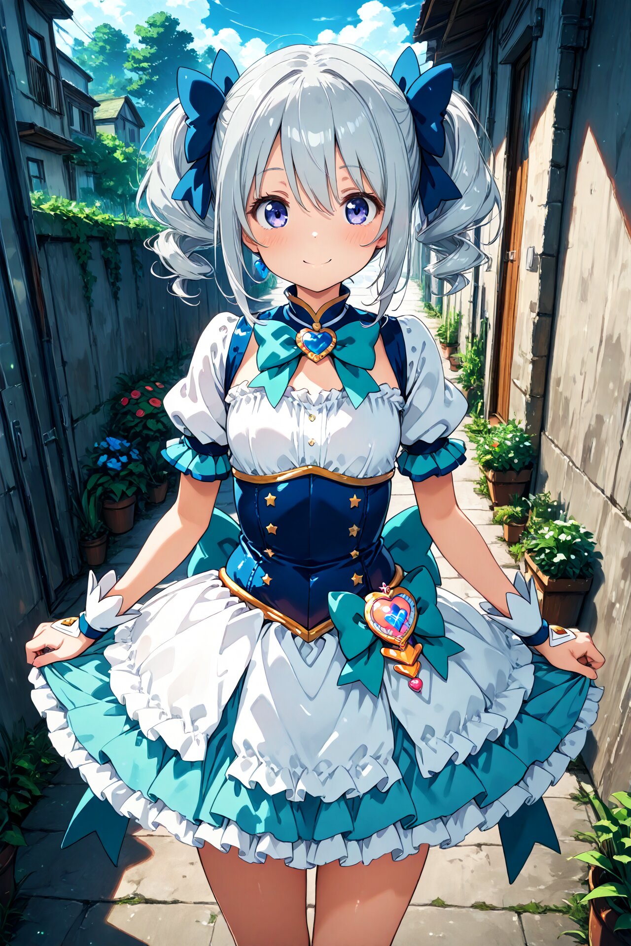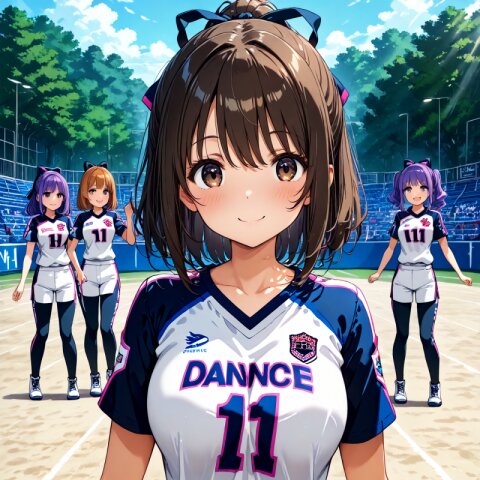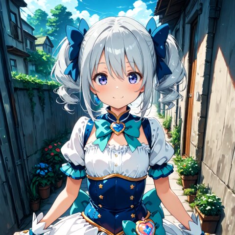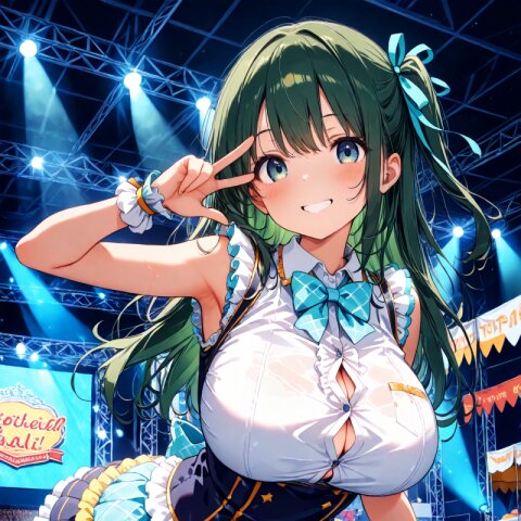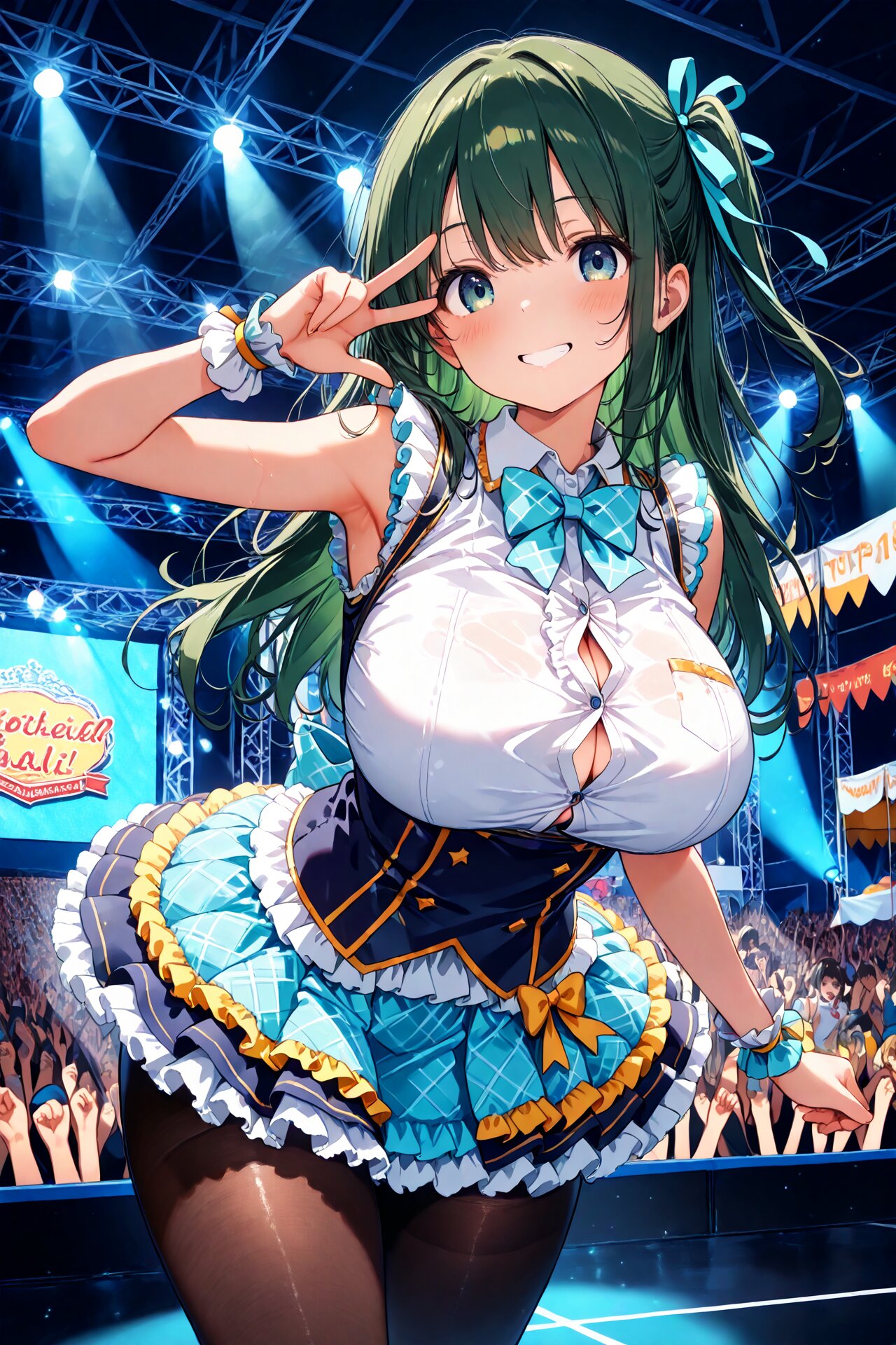 masterpiece, idol, (school festival frilled costume:1.3), (mini skirt:1.3), bow tie, hair ribbon, large breast, (button gap:1.1), sleeveless, tights, smile, stage, spot light,