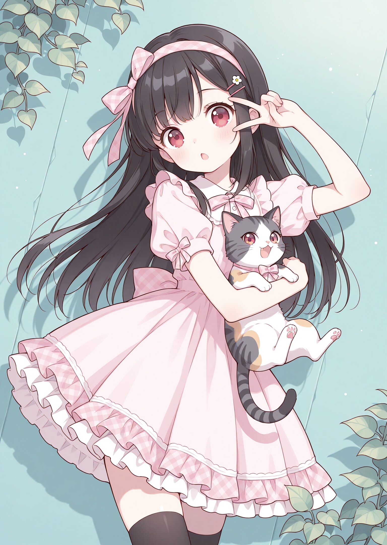 (flat color:0.1),(pale color:0.3), (tareme:0.33), cute 1girl , ruby eyes, straight hair ,black hair ,(hair between eyes:0.5), hairpin,kawaii, (pastel theme :0.5), (depth of field:1.1), (bokeh:0.5),(open mouth :0.9),(excited:0.5) ,(\:D:0.1),(\:o:0.1), (head tilt:0.7), looking at viewer , v over eye, BREAK (holding cat :1.13),(playful cat:1.3), wall, (leaning back:0.3), ivy leaves with flower,pale pink dress, designed dress, kawaii fashion, black thighhighs, headband with plaid ribbon, frilled skirt, puffy short sleeves, refined ,pose, ( from side:0.1),(contrapposto:0.2),