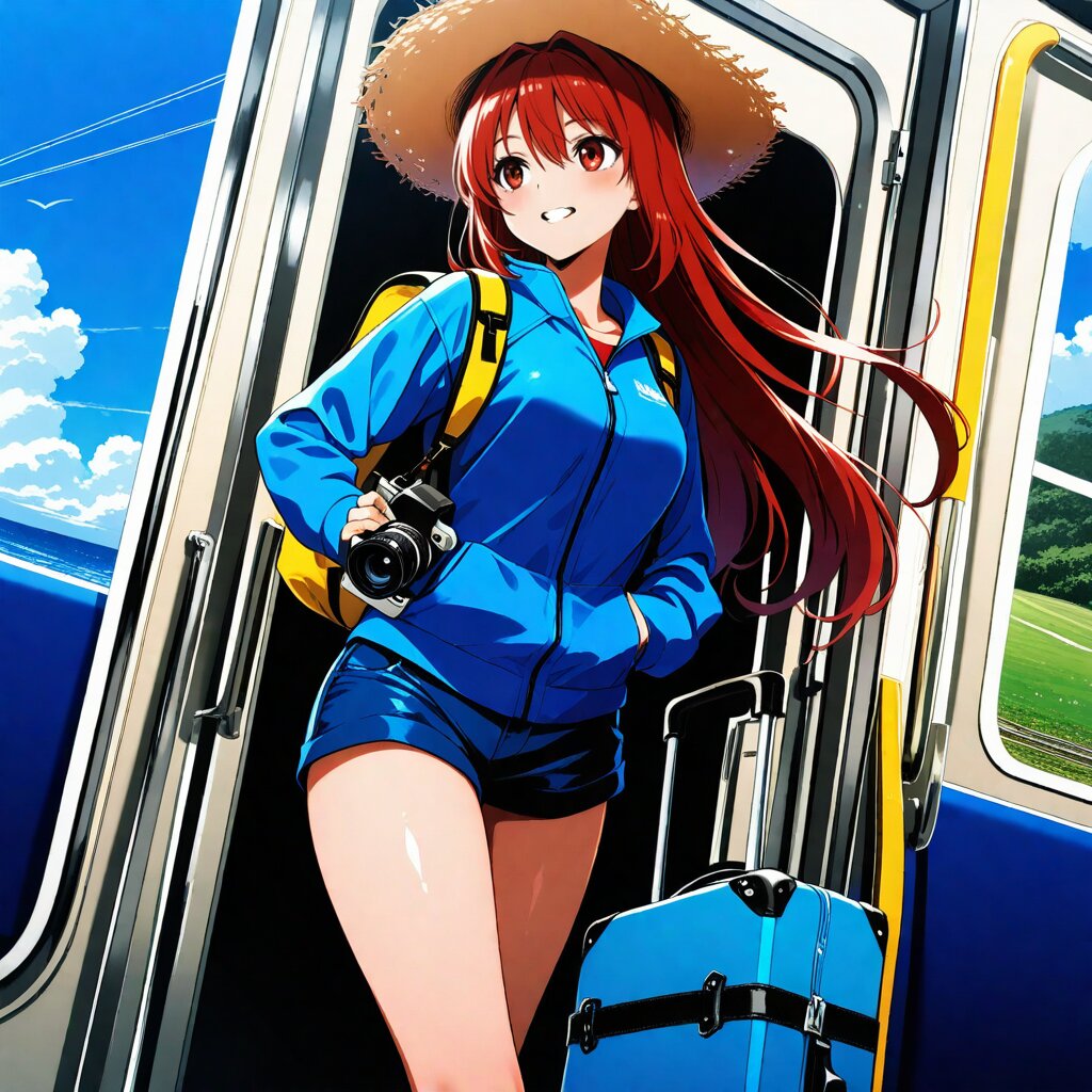 masterpiece,best quality,amazing quality,very aesthetic,absurdres,newest,highres,okashirastyle,8k,extremely detailed CG unity 8k wallpaper,(perfect face:1.2),1lady,27yo,long_hair,brown_hair,red_eyes,hair_between_eyes,very_long_hair,brown_eyes,red_hair,floating_hair,hair_intakes,straight_hair,shiny_skin,(medium_breasts:1.2),(smile), in the train, windows of train, BREAK,Backpack, Hiking boots, Sunhat, Sunglasses, Long sleeves, Shorts, Lightweight, Comfortable, Zippers, Pockets, Water bottle, Camera, Passport, Map, Guidebook, Luggage tags, Rolling suitcase, TSA lock