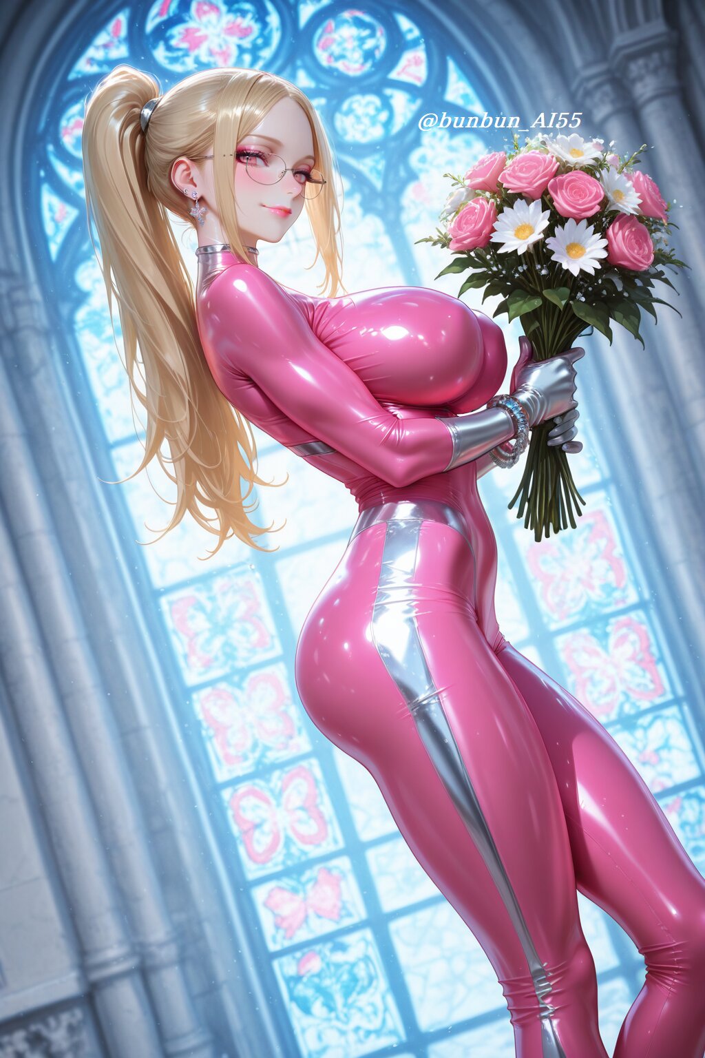 HDR, 8K,masterpiece, best quality, amazing quality, very awa, very aesthetic, absurdres, newest, detailed eyes, realistic eyes, realistic body, (realistic, hyperrealistic), highres, hyper detail, add detail, sharp detailes, sharp lines, sharp focus, anime style, cinematic composition, BREAK perfect lighting, professional lighting, (1girl, beautiful blonde white woman:1.5, 25year old), (sexy, model, adult), (beautiful face, cute face, slim face, small face, detailed face, makeup, pink lips), (looking at viewer, seductive smile, blush), BREAK (blonde hair:1.5, long ponytail:1.5), (stylish glasses), (jewelry, piercing, earrings, bracelet), nsfw, (huge breasts, pointy breasts),(long legs), (perfect hands), (shiny skin, glossy skin), (super model body:1.2, curvy body, athletic body:1.2, muscle body:1.2), BREAK (wearing a tight pink bodysuit with silver lines over a bodystocking:1.5), (latex gloves), (light reflections), (shiny, glossy, luster, latex), (tight fit), BREAK (standing, dynamic pose, confident pose), (holding a colorful bouquet of flowers,), (detailed backbround, standing in front of a stained glass background), (from side | straight-on), (bust-up shot, medium shot, dynamic angle, dutch angle),