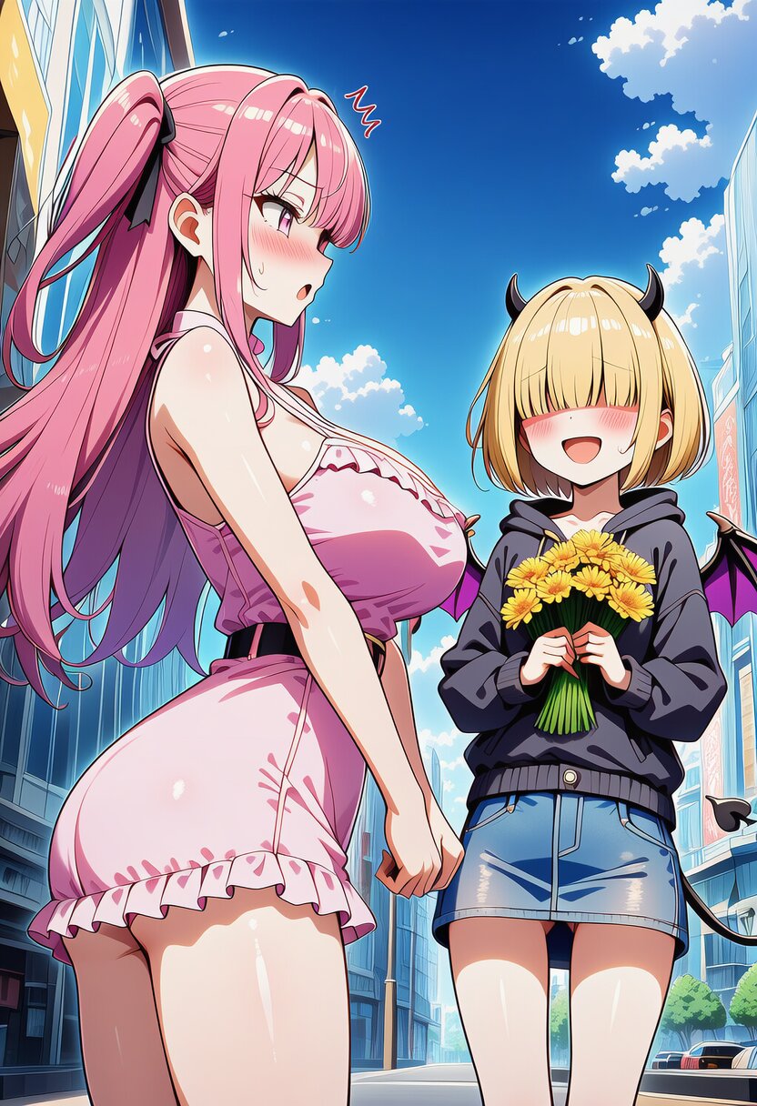 ai-generated, year 2024, 2.5::anime coloring::, 2girls,yuri,facing at each other,outdoor,in down town,dynamic angle, masterpiece, best quality, ultra detailed, perfect fingers, high resolution, absurdres, perfect anotomy, detailed background, unity 8k wallpaper