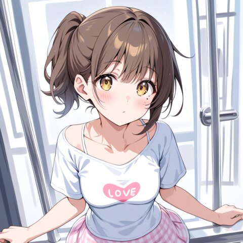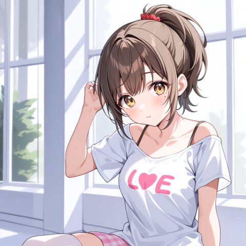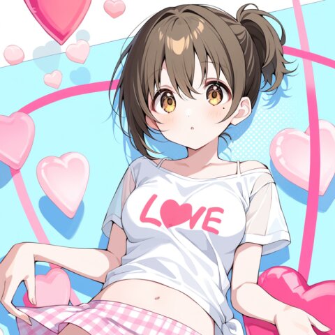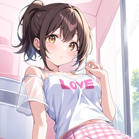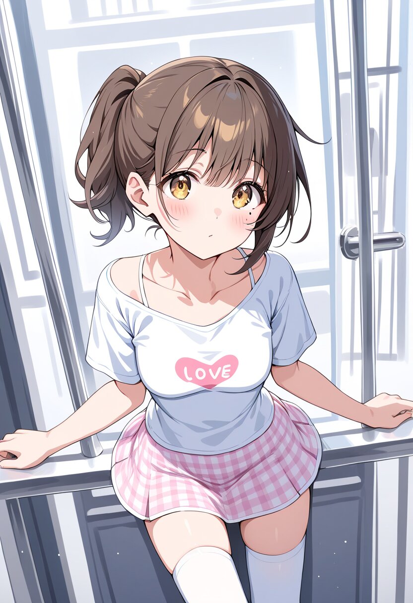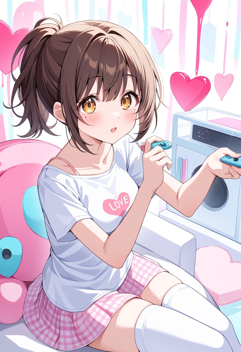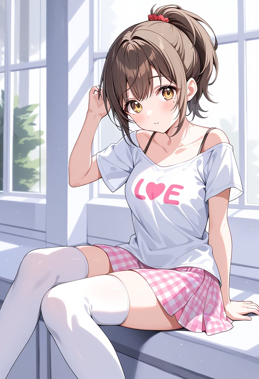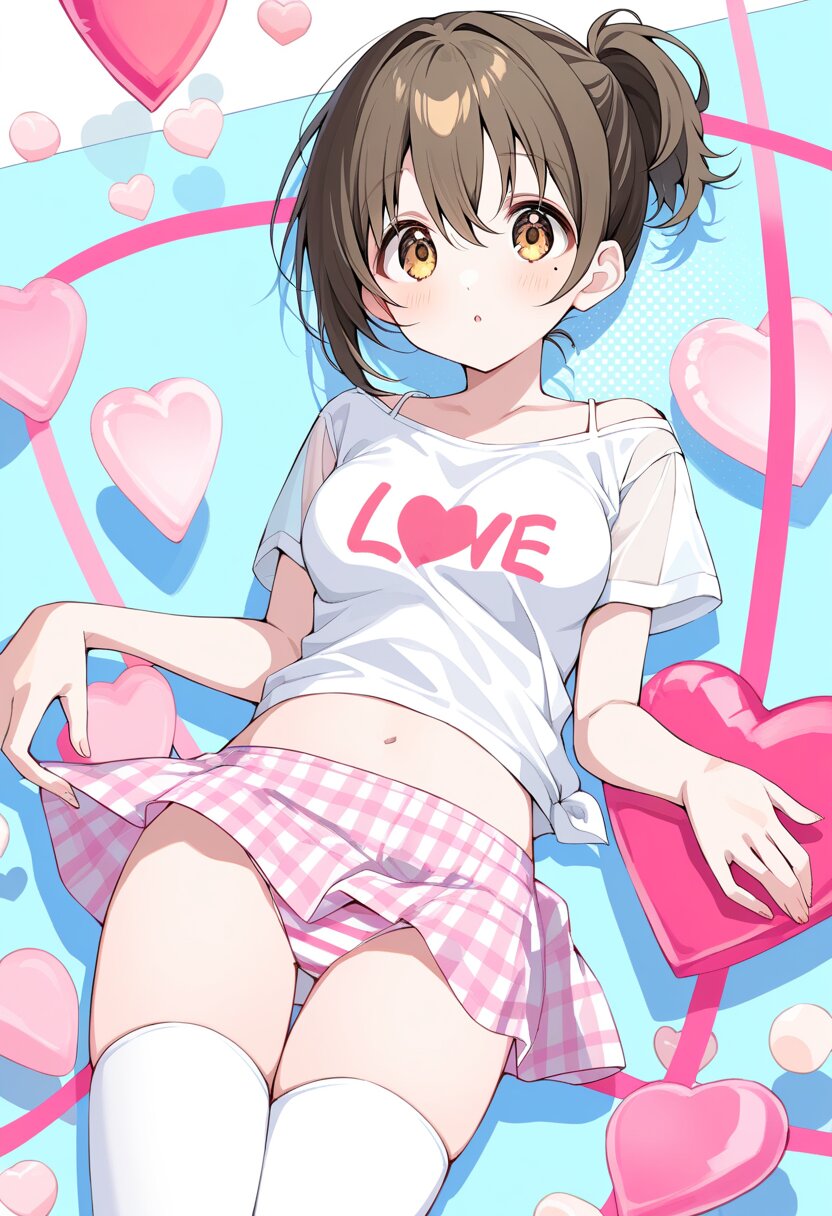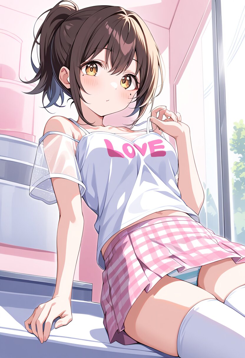White camisole, camisole with "LOVE" printed in pink on the chest area, mesh short-sleeved T-shirt, white mesh short-sleeved T-shirt, checkered miniskirt, pink and white checkered miniskirt, white thigh-high socks, absolute territory,