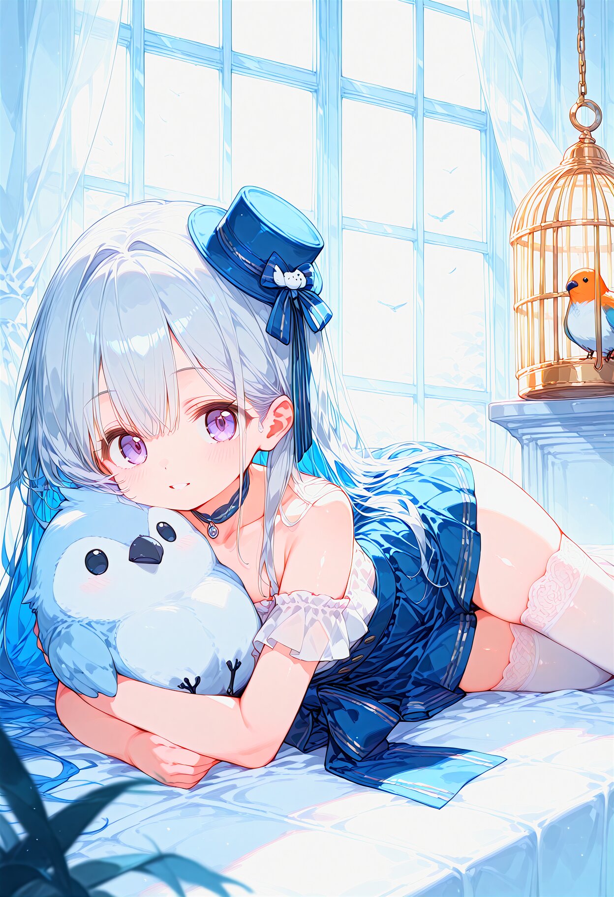beautiful detailed background, best quality, (pale color:0.5), white theme, window, collarbone, parted lips,(Expressionless:0.8), big eyes,(half-closed eyes:0.8), tareme, pale purple eyes, thighhighs, (silver hair:1.1), (dark blue hair colored inner hair:0.8), long hair,very long hair eyebrows visible through hair, white off-shoulder and dark blue skirt, see-through veil, mini hat, blue strapping ribbon and bow, frills, strapping ribbon, choker, see-through, temptation, (bird stuffed toy,object hug,:1.1) birdcage, (Long-tailed Tit,:1.2) Long-tailed Tit stuffed toy, fluffy feathers (lying:1.4), from side, looking at viewer, <lora:noline-16oa:-1.25> <lora:sdxl2-flat2-512b:-1.15> <lora:LECO_Solo:-1.3>