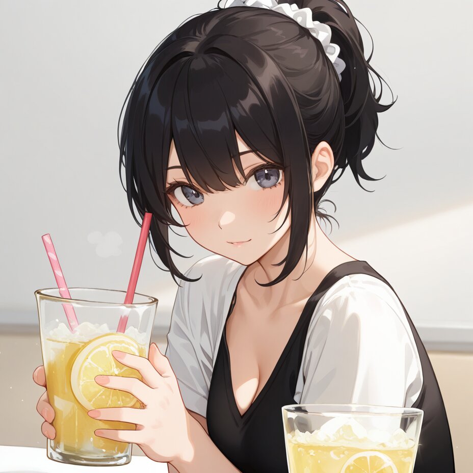 masterpiece, best quality, 1girl, kawaii, black, V-neck, T-shirt, sexy, Office Lady, black hair, ponytail, short hair, White scrunchie, boobs, 1white straw in lemonade glass,