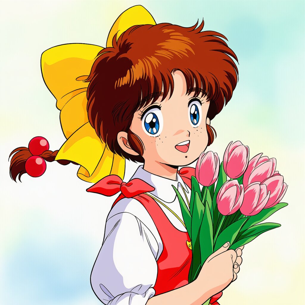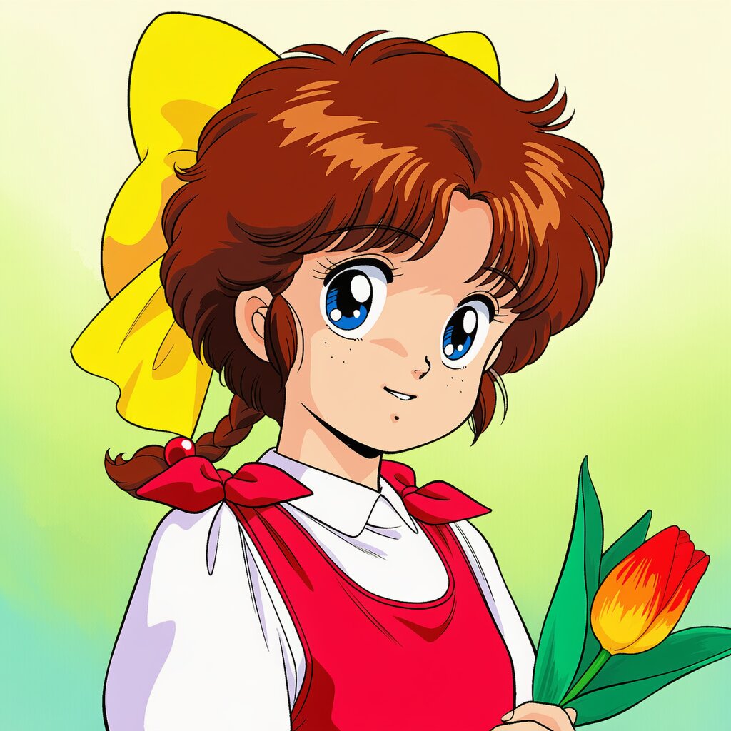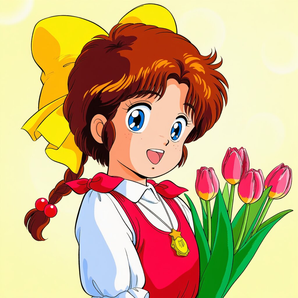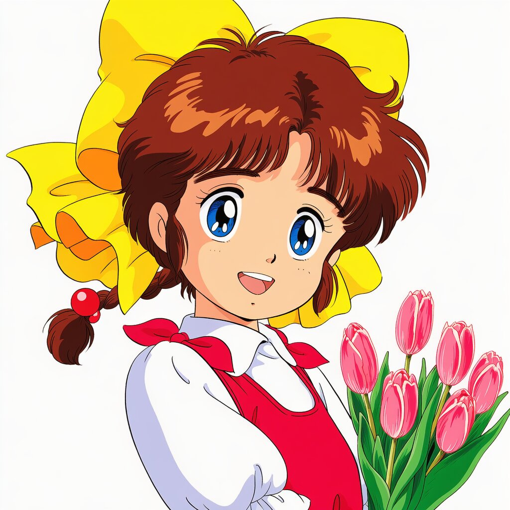 {{{1girl,solo}}},{{{{{game cg,illustration,madeon,masterpiece,taste of japanese anime in 1986,artist:studio pierrot}}}}}, {{official style,kakimaru and keshimaru(mahou no idol pastel yuumi),hanazono yuumi(mahou no idol pastel yuumi)}}, {{10 years old female child,beautiful girl.little female toddler.toddlercon,flat chest,very small breasts}}},{{white collared shirt,red tank top,costume of hanazono yuumi(mahou no idol pastel yuumi),}},{{{wince,beautiful detailed eyes,cute eyes,eyelashes,twinkle eyes,blue eyes}}},{{{{{{brown hair,single braid from behind of head,short hair,big yellow ribbon on back of head,red bobbles on braid,parted bangs}}}}},{{gentle smile,upper teeth,from side}},{{holding bouquet of tulip}},{{simply background,portrait}},rating:general, best quality, very aesthetic, absurdres, no text,, very aesthetic, location, masterpiece, no text, -0.8::feet::, rating:general