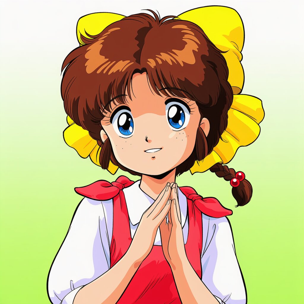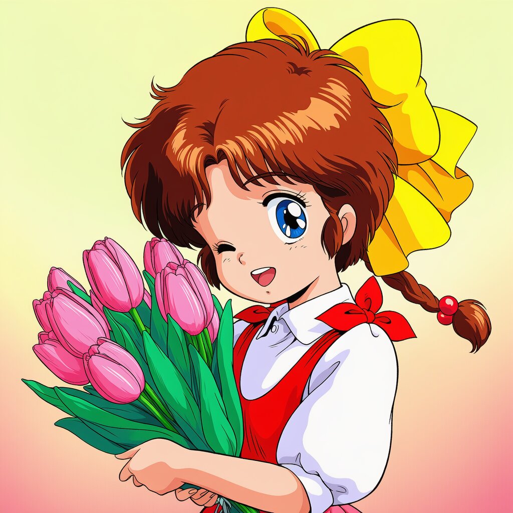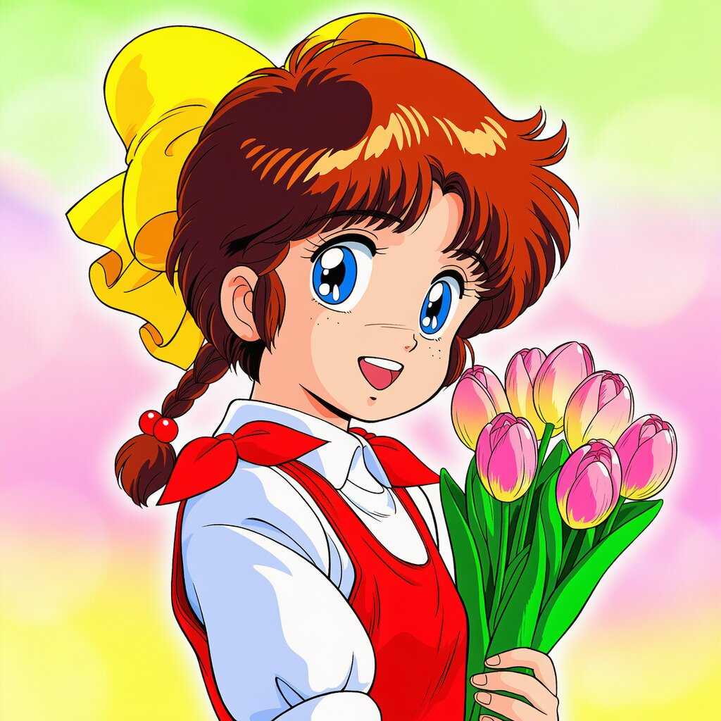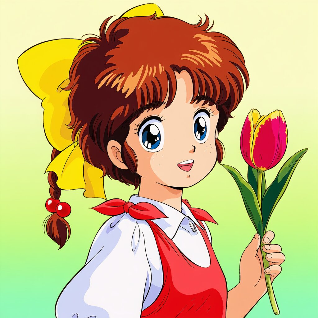 {{{1girl,solo}}},{{{{{game cg,illustration,madeon,masterpiece,taste of japanese anime in 1986,artist:studio pierrot}}}}}, {{official style,kakimaru and keshimaru(mahou no idol pastel yuumi),hanazono yuumi(mahou no idol pastel yuumi)}}, {{10 years old female child,beautiful girl.little female toddler.toddlercon,flat chest,very small breasts}}},{{white collared shirt,red tank top,costume of hanazono yuumi(mahou no idol pastel yuumi),}},{{{wince,beautiful detailed eyes,cute eyes,eyelashes,twinkle eyes,blue eyes}}},{{{{{{brown hair,single braid from behind of head,short hair,big yellow ribbon on back of head,red bobbles on braid,parted bangs}}}}},{{gentle smile,upper teeth,from side}},{{holding bouquet of tulip}},{{simply background,portrait}},rating:general, best quality, very aesthetic, absurdres, no text,, very aesthetic, location, masterpiece, no text, -0.8::feet::, rating:general