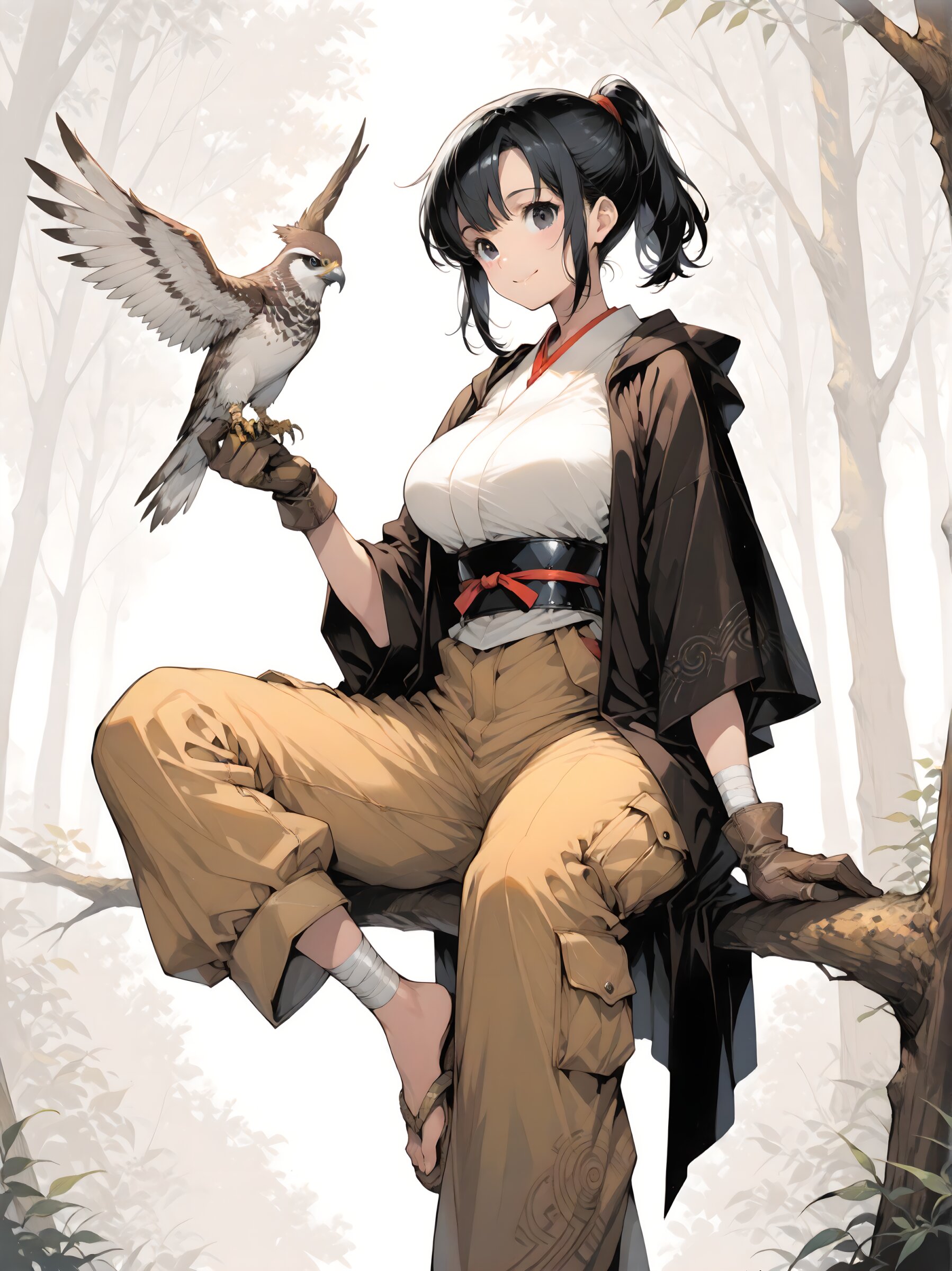 Best quality, Masterpieces, simple background, lots of negative space, delicate anime-style illustration, white background, fine detail, solo, (young girl), cute face and eyes, big breasts, black hair, clear black eyes, single short ponytail hair, cute and lovely, Vigorous, lively, and spontaneous personality, traditional falconer, patterned kariginu, straw coat, hunting robes, bandaged arm, leather gloves, kyahan leg wraps, straw sandals, cargo pants, with a falcon perched on arm, natural forest background, cinematic lighting, smile,
