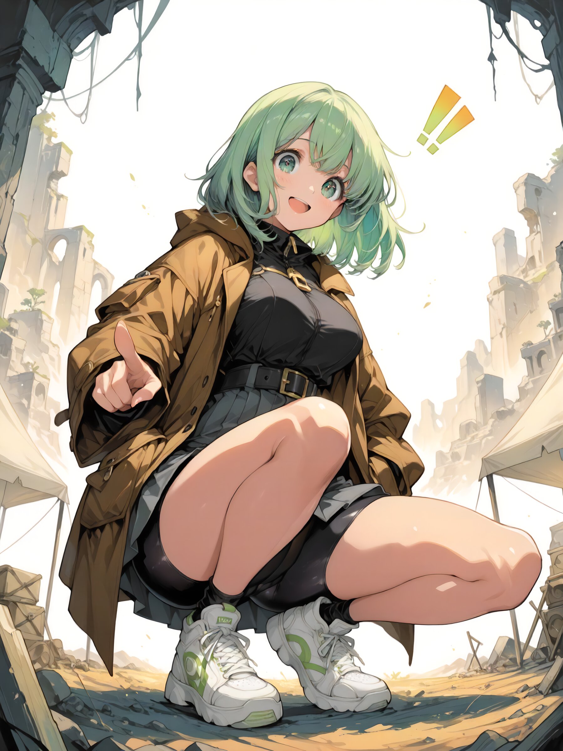 Best quality, Masterpieces, simple background, lots of negative space, delicate anime-style illustration, fine detail, solo, young girl, small body, kawaii, round face, green hair, green eyes, Big eyes, midium breasts, medium hair, shaggy bobbed hair, always calm, world wanderer, Fascinating, shy, ((chunky sneakers)), chest slit, defined waistline, bike shorts under skirt, bottomless, A deep brown leather coat with a weathered texture, Dark grey, flexible trousers for ease of movement, (A black adjustable belt with (numerous storage pockets)), Archaeological excavation camp. A camp where adventurers use as a base for excavating ruins. Tents stand in a row, and mined treasures and ancient books are scattered about. Ancient ruins can be seen in the distance. With the excitement of exploration and discovery., smile, open mouth, !!, squatting, pointing at viewer, cinematic angle,