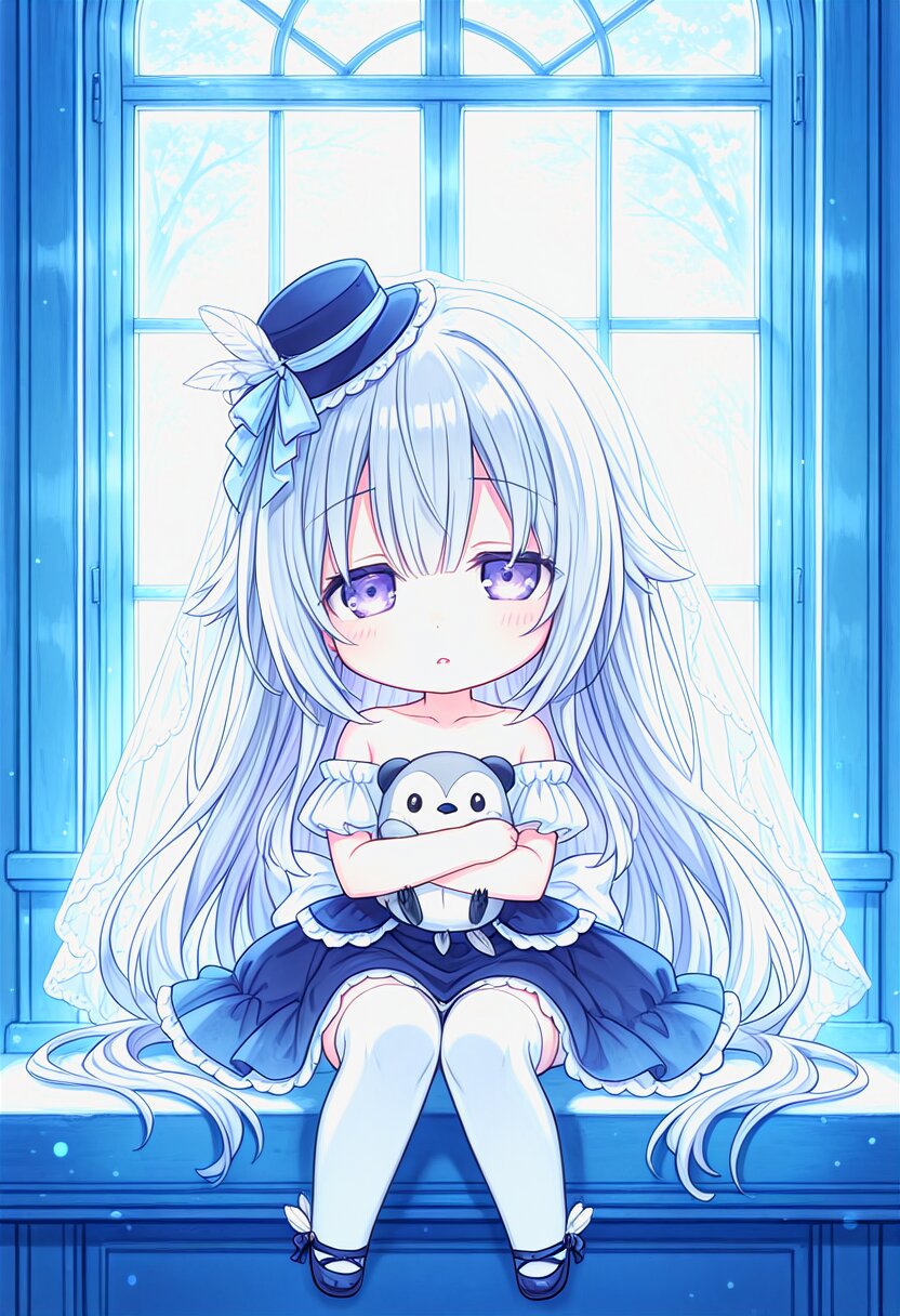 best quality, (pale color:0.7), blue theme, pastel colors, full body, portrait, window, solo, (chibi), (chibi girl:1.2), collarbone, parted lips,(Expressionless:0.8), (half-closed eyes:0.8), pale purple eyes, tareme, (silver hair:1.1), (dark blue hair colored inner hair:0.8), long hair,very long hair,, eyebrows visible through hair, white off-shoulder and dark blue skirt, mini hat,strapping ribbon, see-through veil, thighhighs, sitting, (bird stuffed toy,object hug,:1.1) (Long-tailed Tit,:1.2) Long-tailed Tit stuffed toy, fluffy feathers looking at viewer, <lora:noline-16oa:-1.1> <lora:chibi_paru:-1.3> <lora:sdxl2-flat2-512b:-1.1>