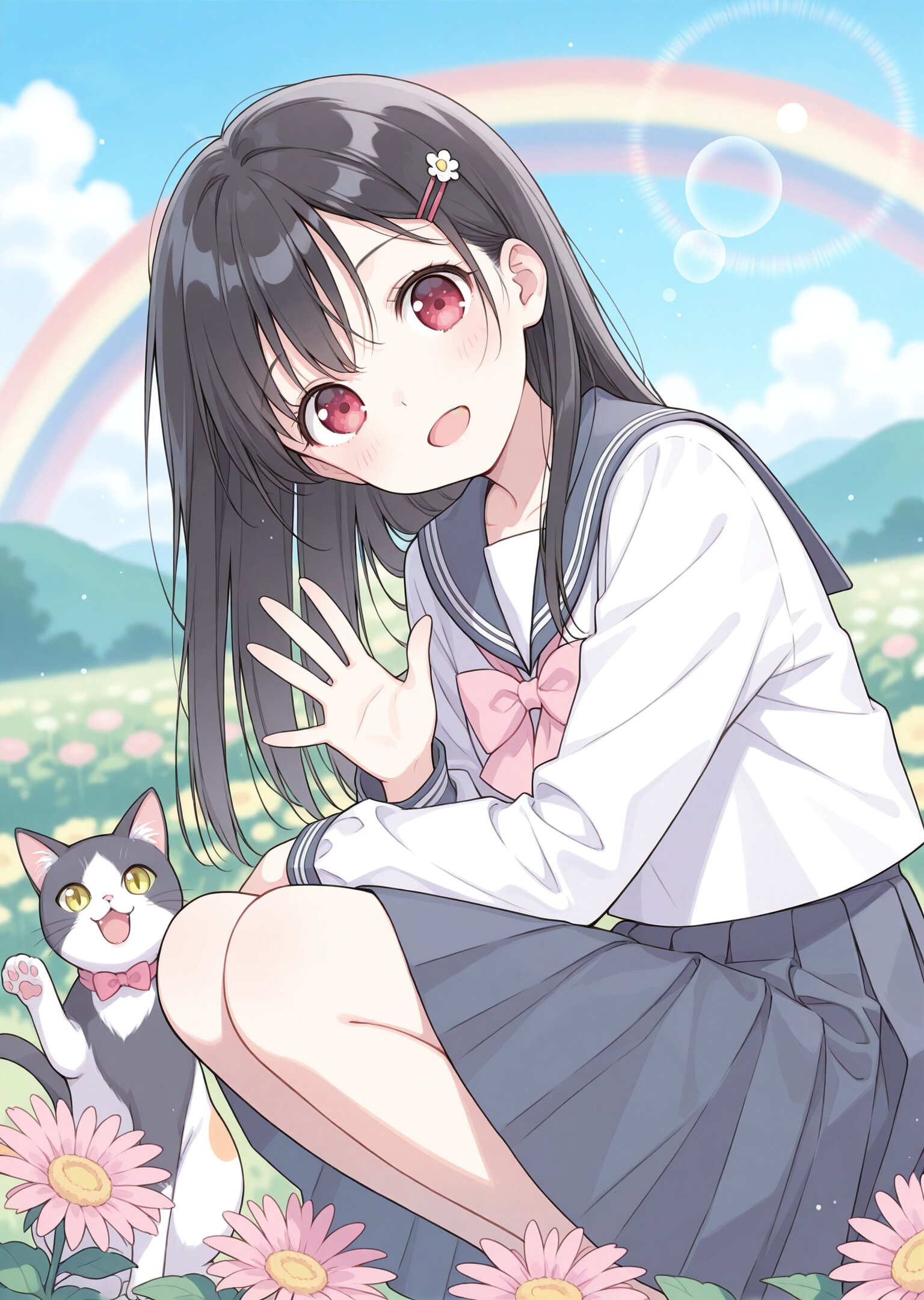 (flat color:0.1),(pale color:0.3), (tareme:0.33), cute 1girl , ruby eyes, straight hair ,black hair ,(hair between eyes:0.5), hairpin,kawaii, (pastel theme :0.5), (depth of field:1.1), (bokeh, lens flare:0.6),(open mouth :0.9),(excited:0.1) ,(\:D:0.2),(\:o:0.1), (head tilt:0.7), rainbow , BREAK (cat :1.1),(playful cat:1.3), serafuku, pleated skirt, pink bowtie, squatting, flower, outdoors, refined ,waving pose, ( from side:0.1), ( dutch angle:0.0),(contrapposto:0.2),