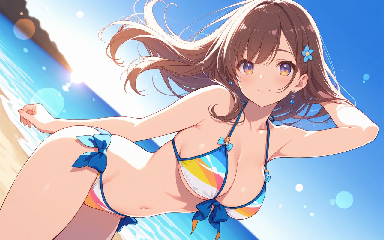 1 girl, solo, (17YO:1.3), brown hair, long hair , (bouncing hair:1.2), cute girl, voluptuous, ( transparent bikini), vivid color bikini, bow-bikini nice pose , twisted torso, head tilt, cowboy shot , smile, front shot look viewer, BREAK (masterpiece:1.5),8k,4k,(best quality), (flat color:1.5), (soft saturation:1.4), (warm lighting:1.5), (bloom:1.3), (high brightness:1.3), curviy, (day time), (beach, blue sky:1.5), (cinematic angle:1.3), (dutch angle:1.4), (lens flare, bokeh:1.3), (Extremely detailed face),(Extremely detailed eyes), (cute:1.5), <lora:detailed_notrigger:1> <lora:Expressive_H:1>