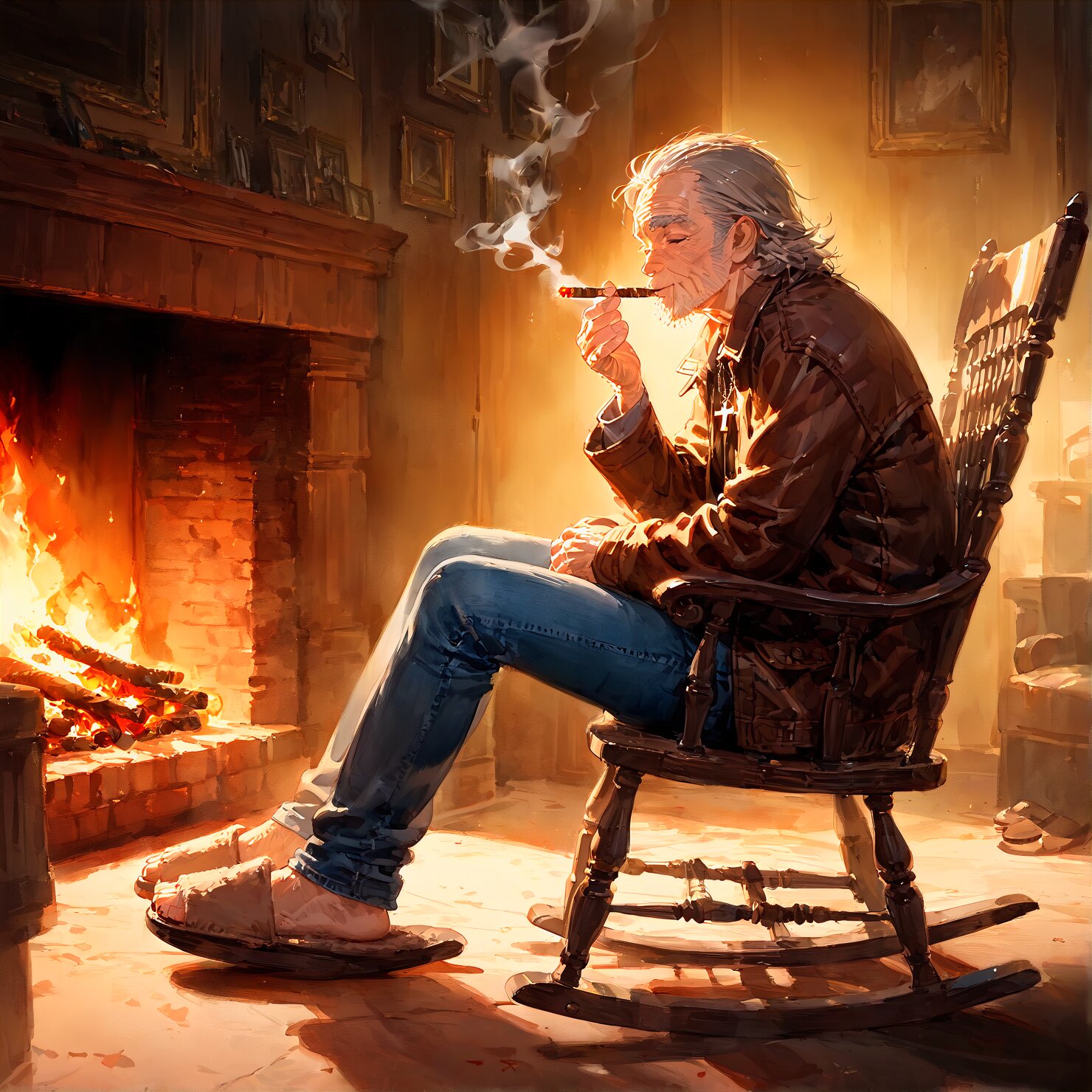 ((ultra high resolution,extremely detailed CG,official art,cinematic shadow,cinematic lighting,)) old man, sitting rocking chair, from side,smoking, jeans, brown leather jacket on naked, looking at viewer, Caucasoid, mini cross necklace, smoking cigar, cigar in mouth, closed eyes, foot rest, fire place,slippers,happy,face hairs, <lora:traditional_watercolor_painting:0.68> traditional watercolor painting