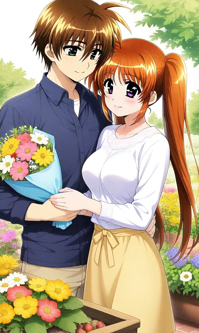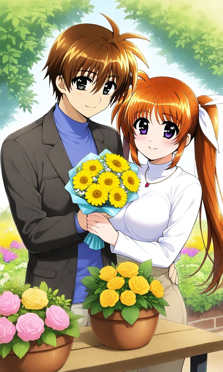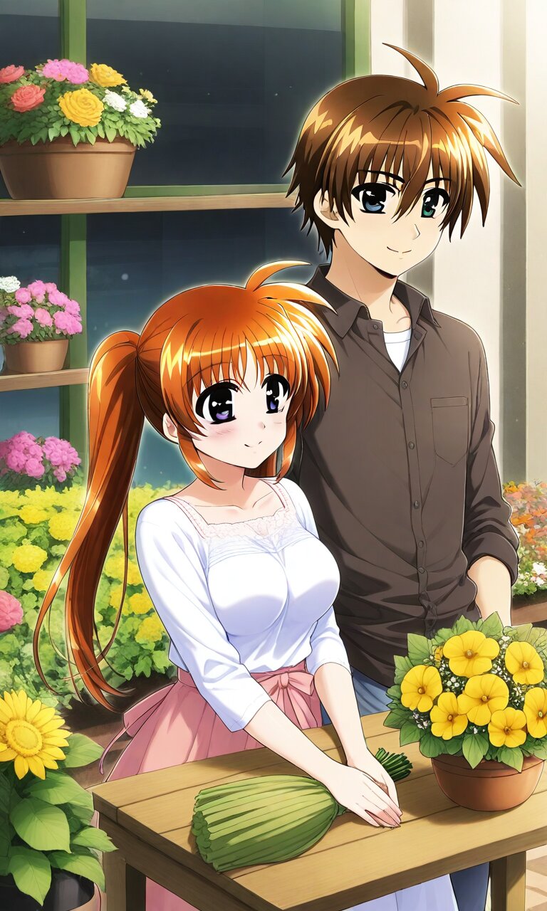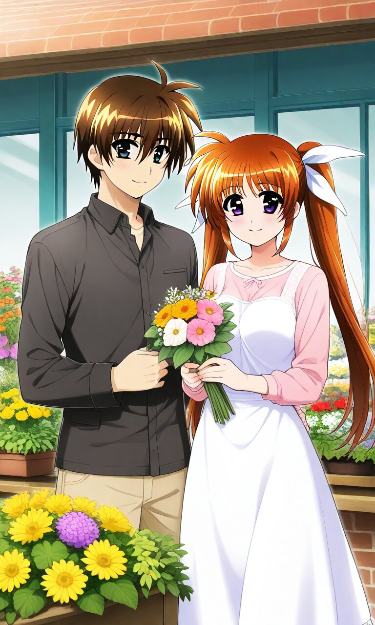 Couple, boy and girl, two people only,absurdres, ultra-detailed, master piece, high resolution, 8k, Boy, girl, couple,Florist, workbench, colorful flowers, making bouquets together. BREAK the boy(original boy,black eyes, black short hair) BREAK the girl(takamachi_nanoha, 1girl, solo, brown hair, twintails, long hair, purple eyes, large breasts, ),