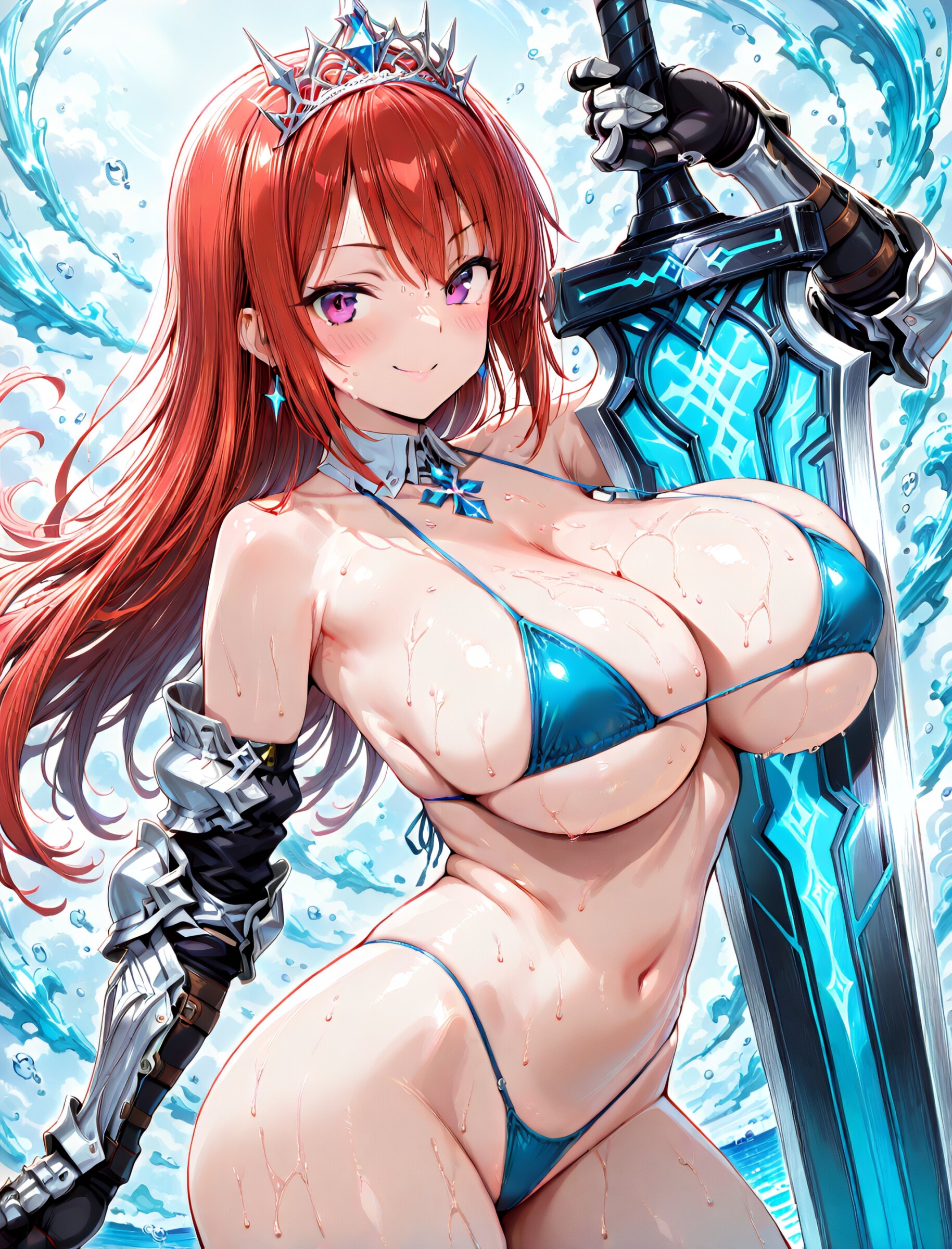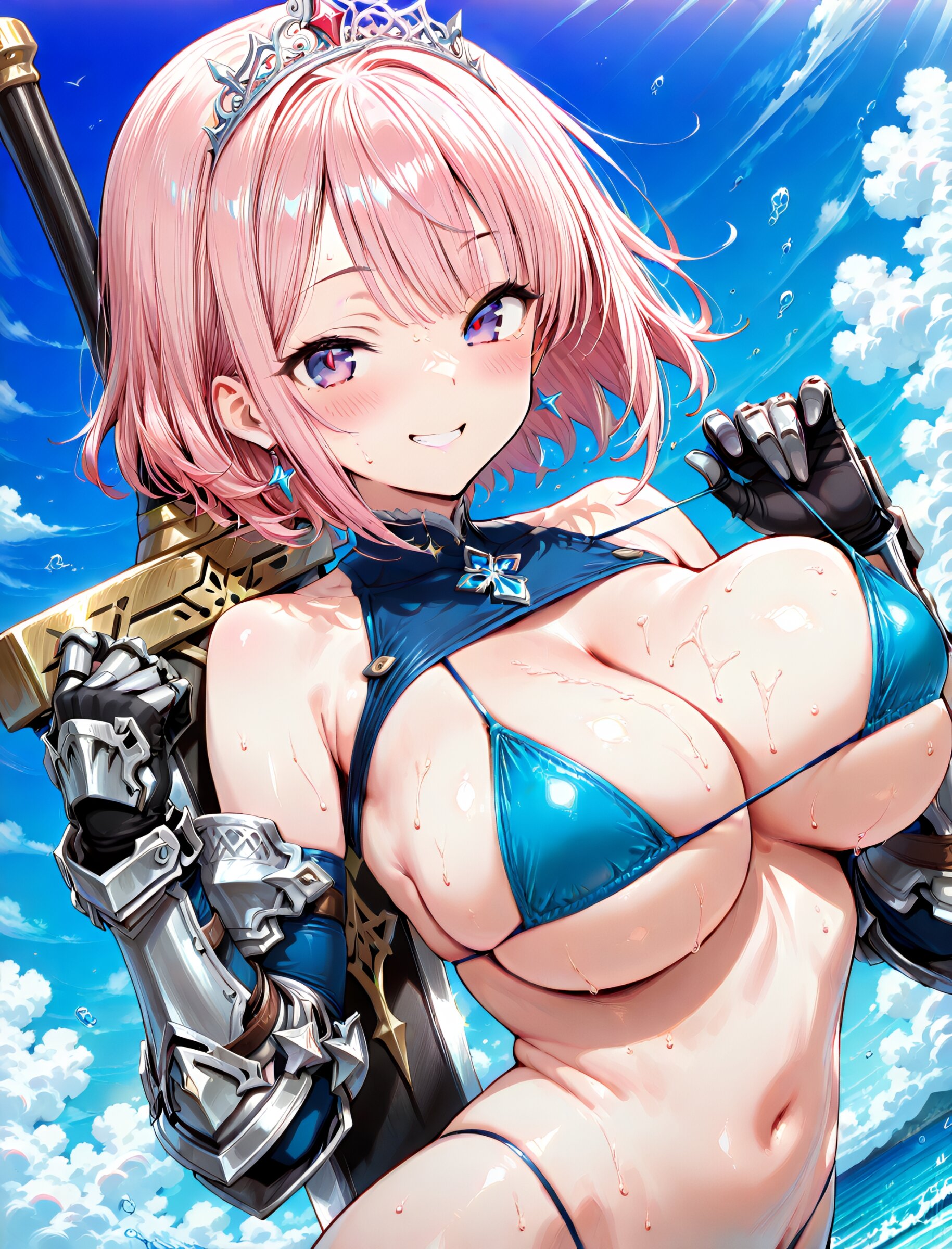 (upper body1.8), 1 cute girl, (micro bikini), (thong),(heavy gauntlets:1.4), (large breast), (enormous great sword), (oversized sword strapped on back), smile,(sweat), (large tiara:1.5), (masterpiece), (best quality), (8k resolution), very aesthetic, amazing quality,(dynamic angle:1.4),(dynamic pose:1.4), <lora:noobai_ep11_stabilizer_v0.11_fp16:0.7> <lora:StS-Illustrious-Detail-Slider-v1.0:2.> <lora:sdxl-hairdetailer_02:2> <lora:xl_more_art-full_v1:1.4> <lora:spo_sdxl_10ep_4k-data_lora_webui:0.7>