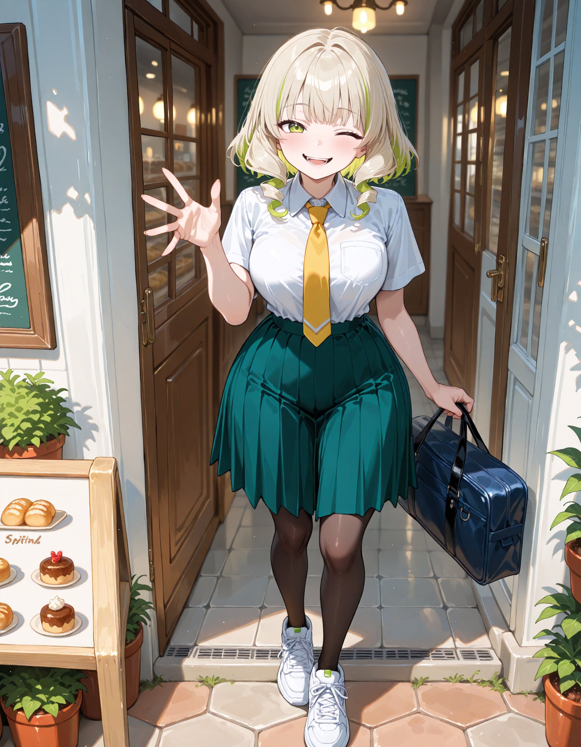 foreshortening, (close up:1.0) looking at viewer, Line art is drawn in a warm brown tone instead of black. The outlines have a soft, earthy feel, adding a gentle and nostalgic atmosphere to the illustration. 1girl, beautiful detailed eyes, cute face, cool, pale skin, skindentation, beautiful cobalt green eyes, , , multicolored hair, platinum blonde hair, deep skyblue and moss green and blonde hair cute, medium hair, Curl inward hair blunt ends , oily hair, first-rate female body perfect body beautiful framed breasts, wide hips,, warm comfy affectionate expression, loving, tender, caring (laughing:1.5) and one eye closed and action, seductive smile buttercup yellow necktie, white collared shirt, short sleeves, long plated skirt, black pantyhose, sneakers , a school bag (smirk:1.2), depth of field, bokeh, bakery, storefront, ,, spring sunlight, morning, sunshine, direct lighting, spring morning, cloudy sky open hand, walking morning masterpiece, best quality, amazing quality, very aesthetic, absurdres, newest, you can add scenery, (volumetric lighting), To make the background more distinctive. professional art lots of details, , overexposure, shiny-glistening, (watercolor style:1.0), (pastel color style:1.0) <lora:noline (1):-0.5> <lora:sdxl2-flat2-512b:0.15> <lora:facelightup_xl_v10:0.5>