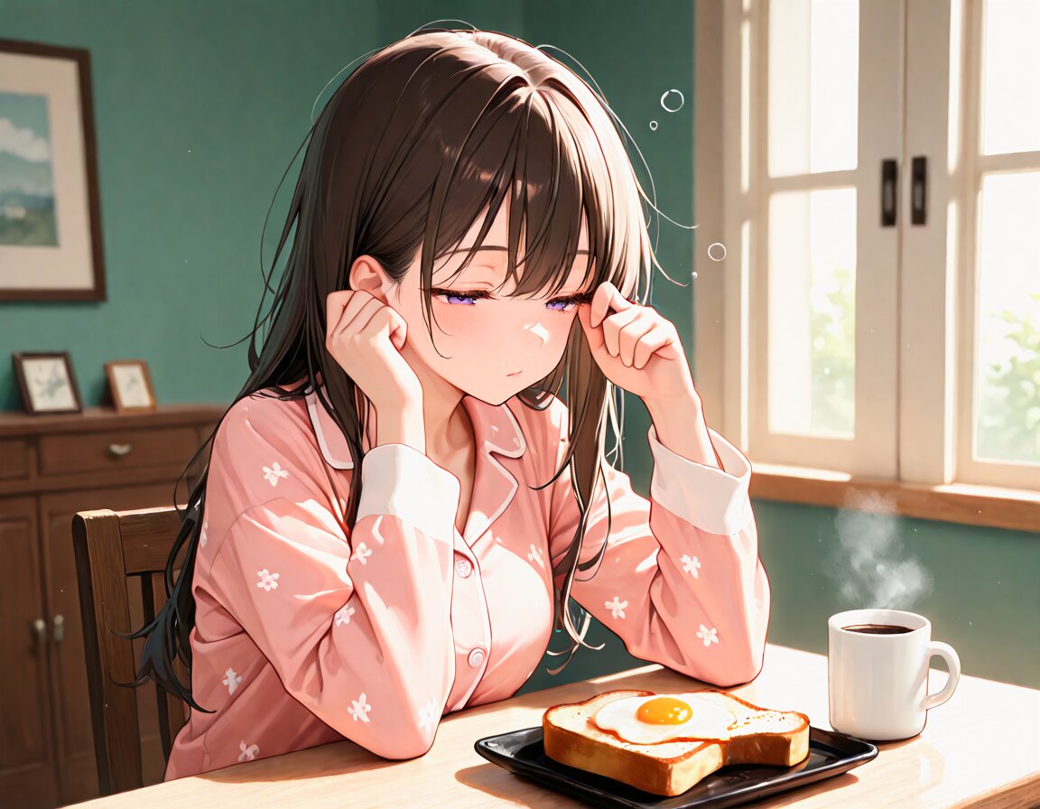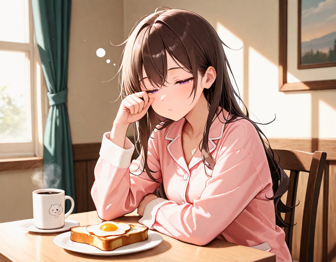 1girl,solo,sitting,sleepy,half-closed eyes,Rub eyes,upper body, table,dining room,pajamas,coffee mug,fried egg on toast, at morning,, appropriate posture,appropriate configuration,ideal ratio body proportions,perfect anatomy, <lora:Fixhands_anime_bdsqlsz_V1:1>, masterpiece,best quality,newest,absurdres,highres,ultra high res,8K UHD,hyper-detailed,