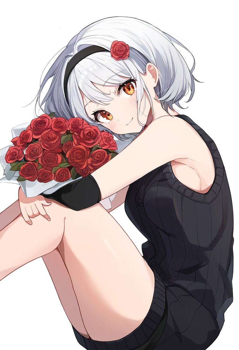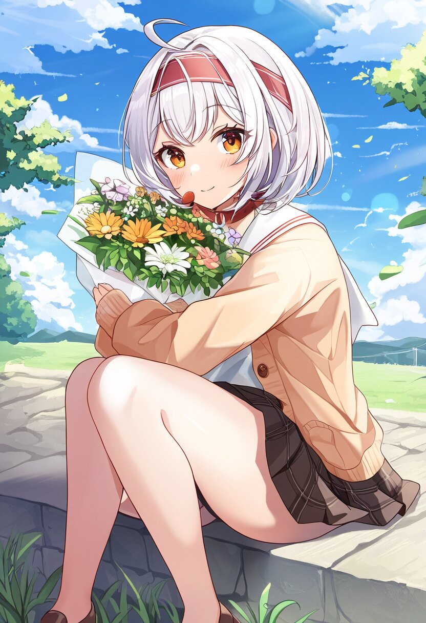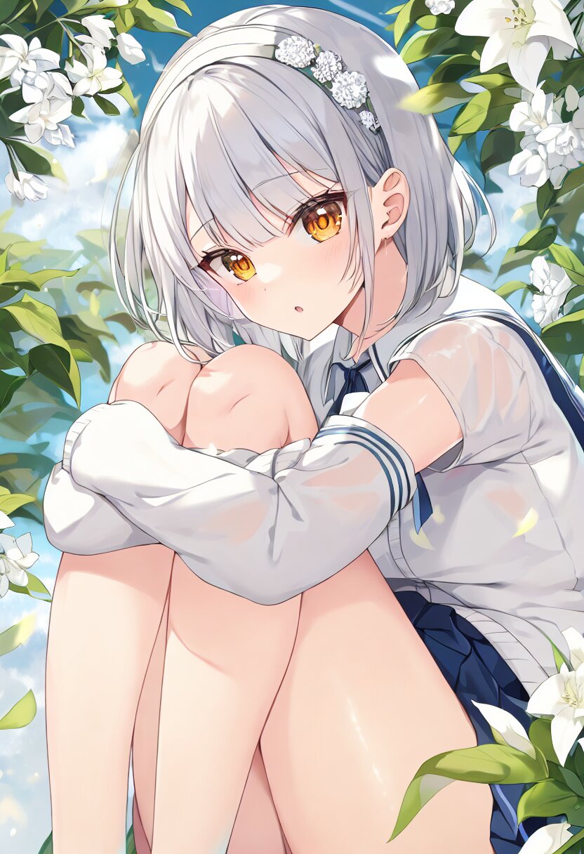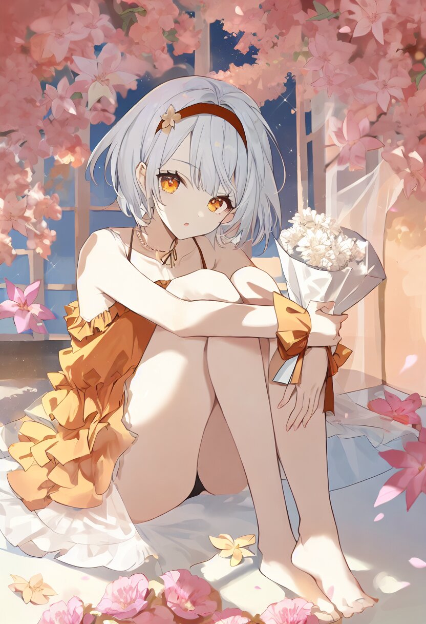 1girl, scenery, portrait, orange eyes, short hair, white hair, arched bangs, hip bones, biceps, headband, cardigan, hugging own legs, see-through, neck ruff, baozi, bouquet, elbow pads, danmaku, , best quality, amazing quality, very aesthetic, absurdres