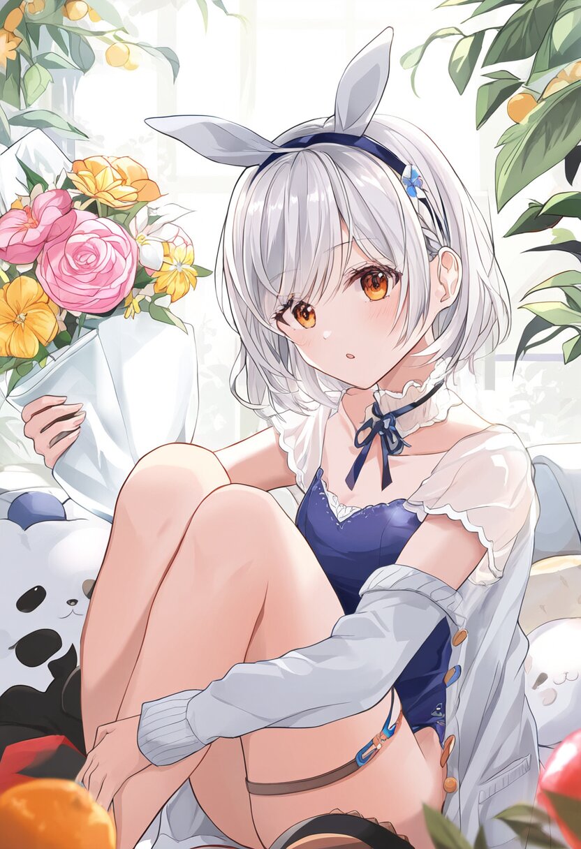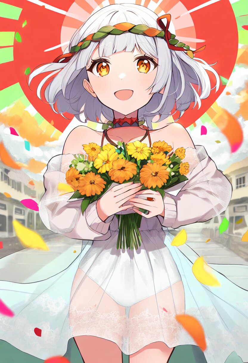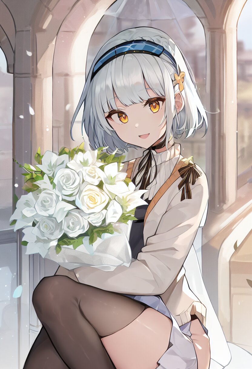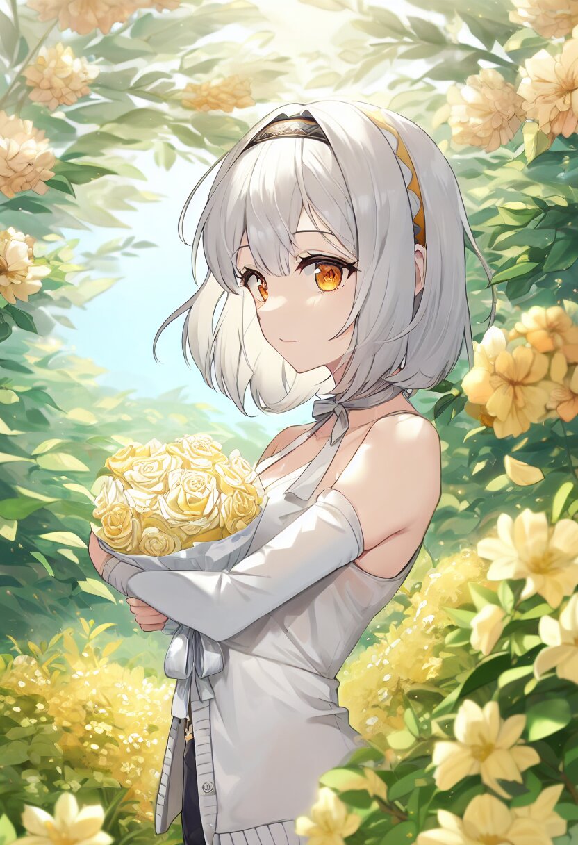 1girl, scenery, portrait, orange eyes, short hair, white hair, arched bangs, hip bones, biceps, headband, cardigan, hugging own legs, see-through, neck ruff, baozi, bouquet, elbow pads, danmaku, , best quality, amazing quality, very aesthetic, absurdres