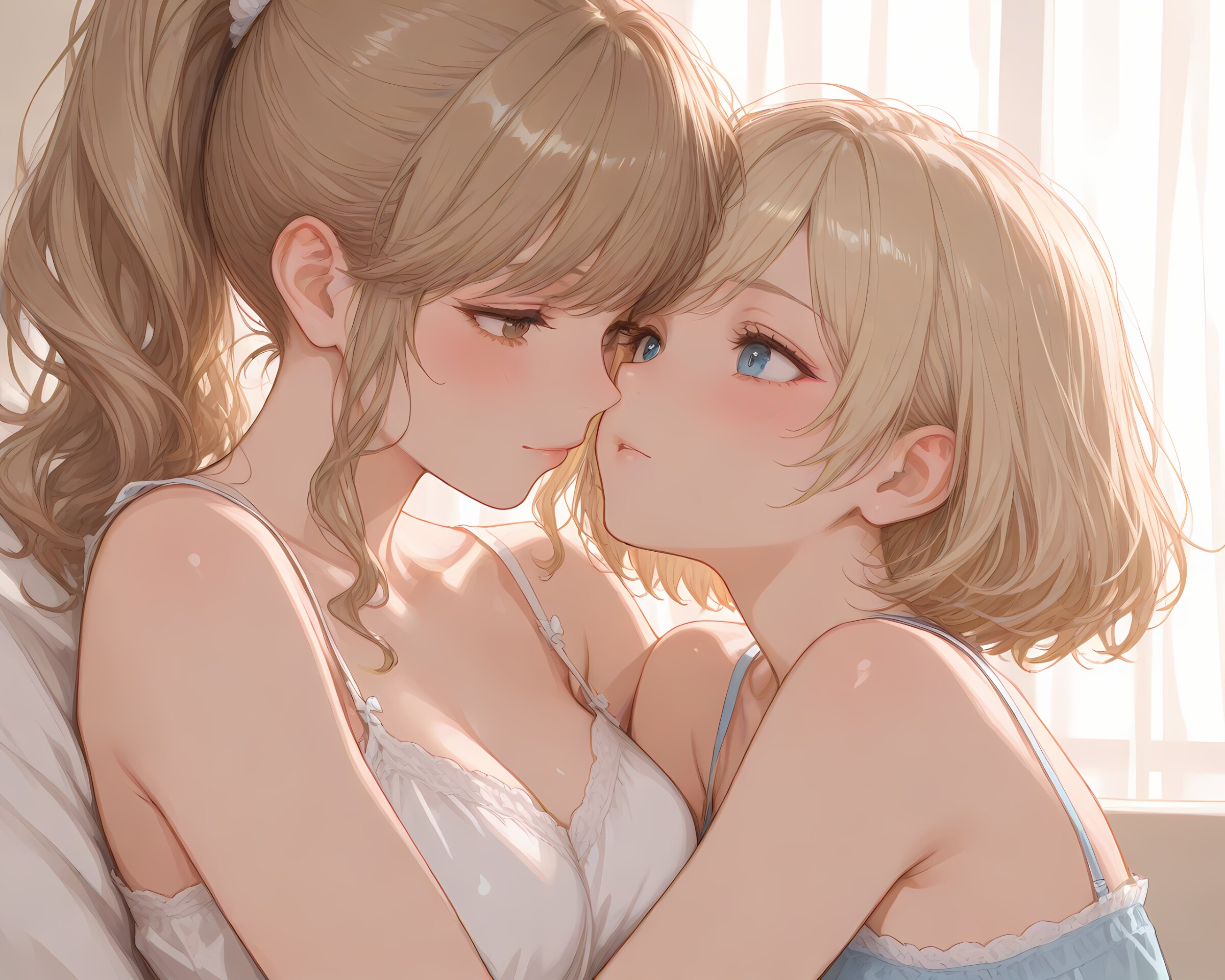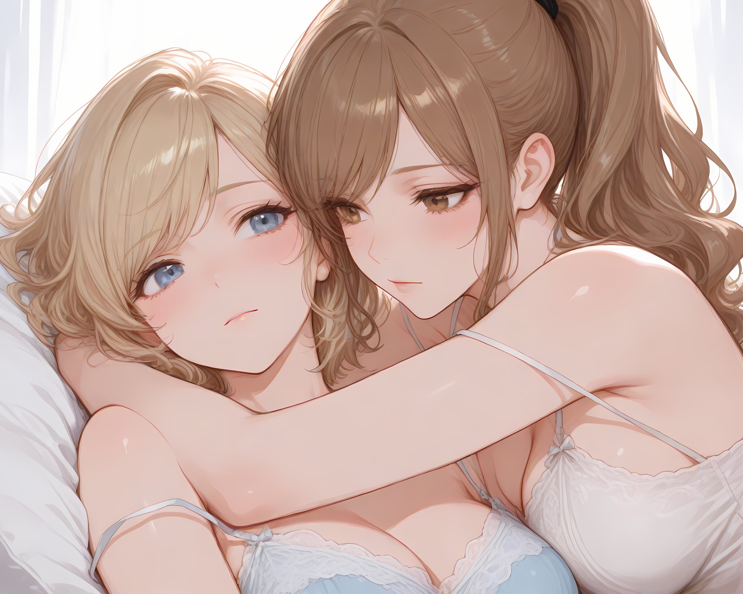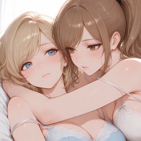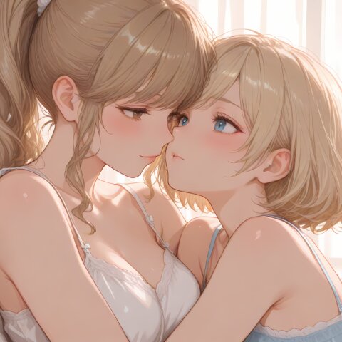 <lora:hyper_sdxl_8_step_lora_f16:1>,, 2Girls, duo, Yuri, hugging, looking at each other, close-up, emotional connection, BREAK beautiful lady, Married woman, 30 years old, long hair, brown hair, high ponytail, large breasts, brown eyes, camisole, blush, BREAK 18 years old, girl, short hair, wavy blonde hair, swept bangs, medium breasts, slender, frosty blue eyes, camisole, blush, BREAK masterpiece, amazing quality, best quality, ultra-detailed, 8K, newest, Japanese, dynamic composition, cinematic style, vibrant colors, natural lighting,