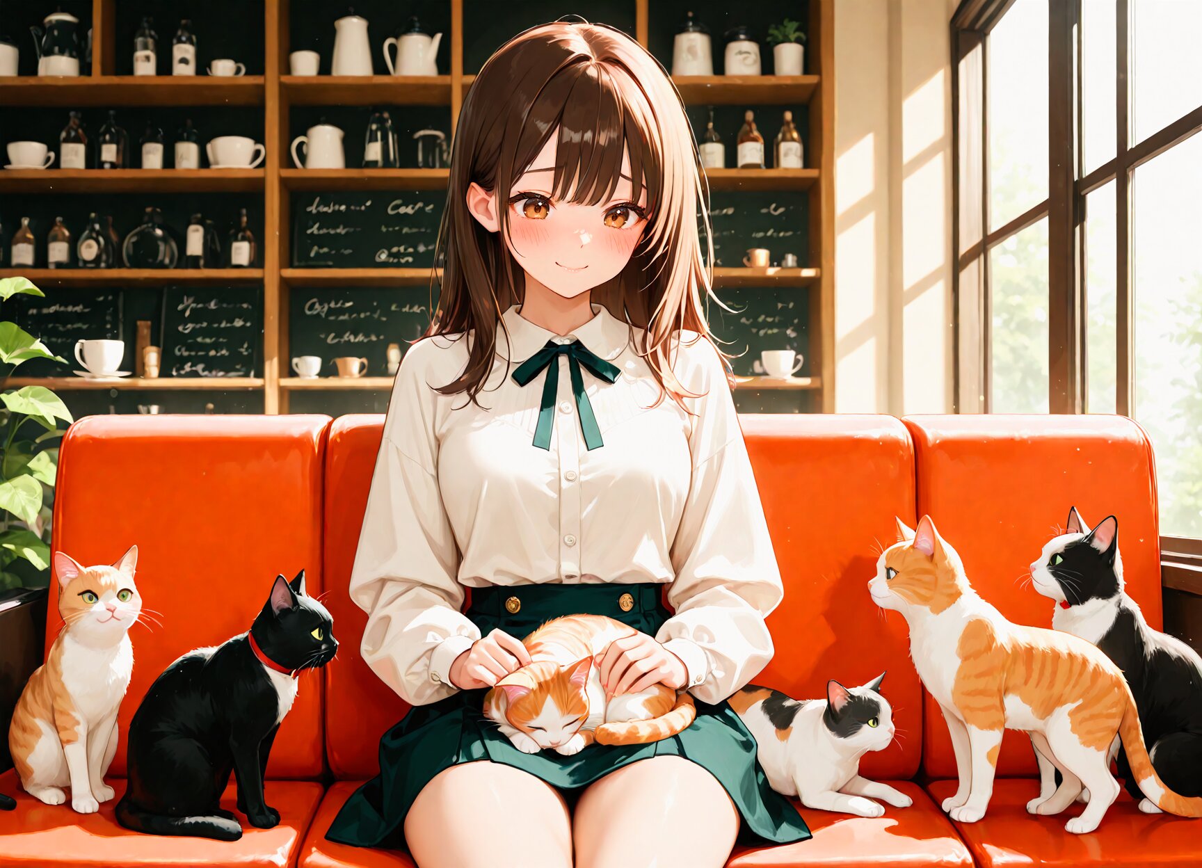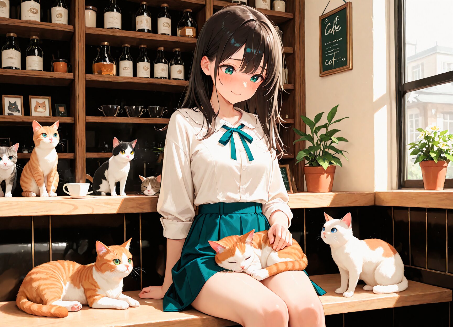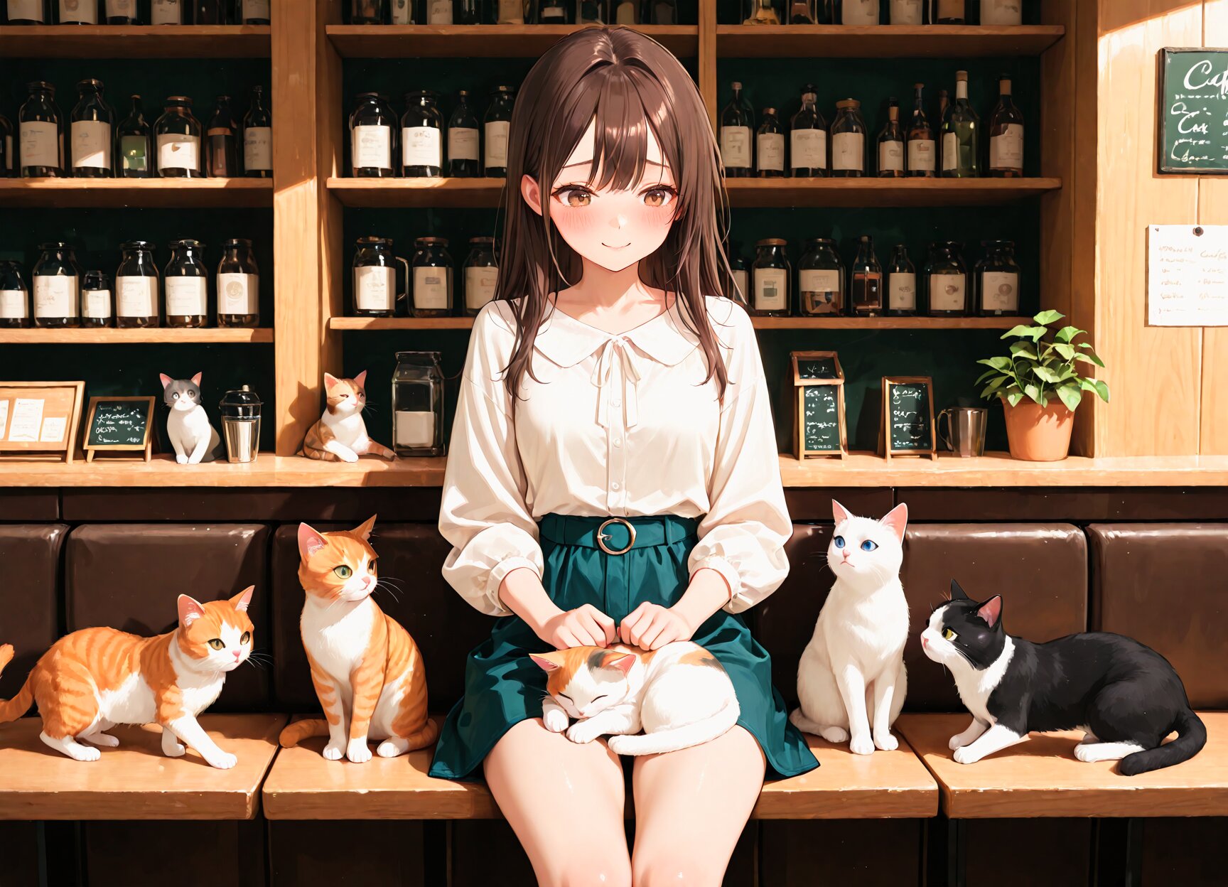 1girl,solo,sitting,cafe,too many cats,cat on thighs,gentle smile,embarrassed,blush,cowboy shot,stroking cat,looking at cat, general,safe,, appropriate posture,appropriate configuration,ideal ratio body proportions,perfect anatomy, <lora:Fixhands_anime_bdsqlsz_V1:1>, masterpiece,best quality,newest,absurdres,highres,ultra high res,8K UHD,hyper-detailed,