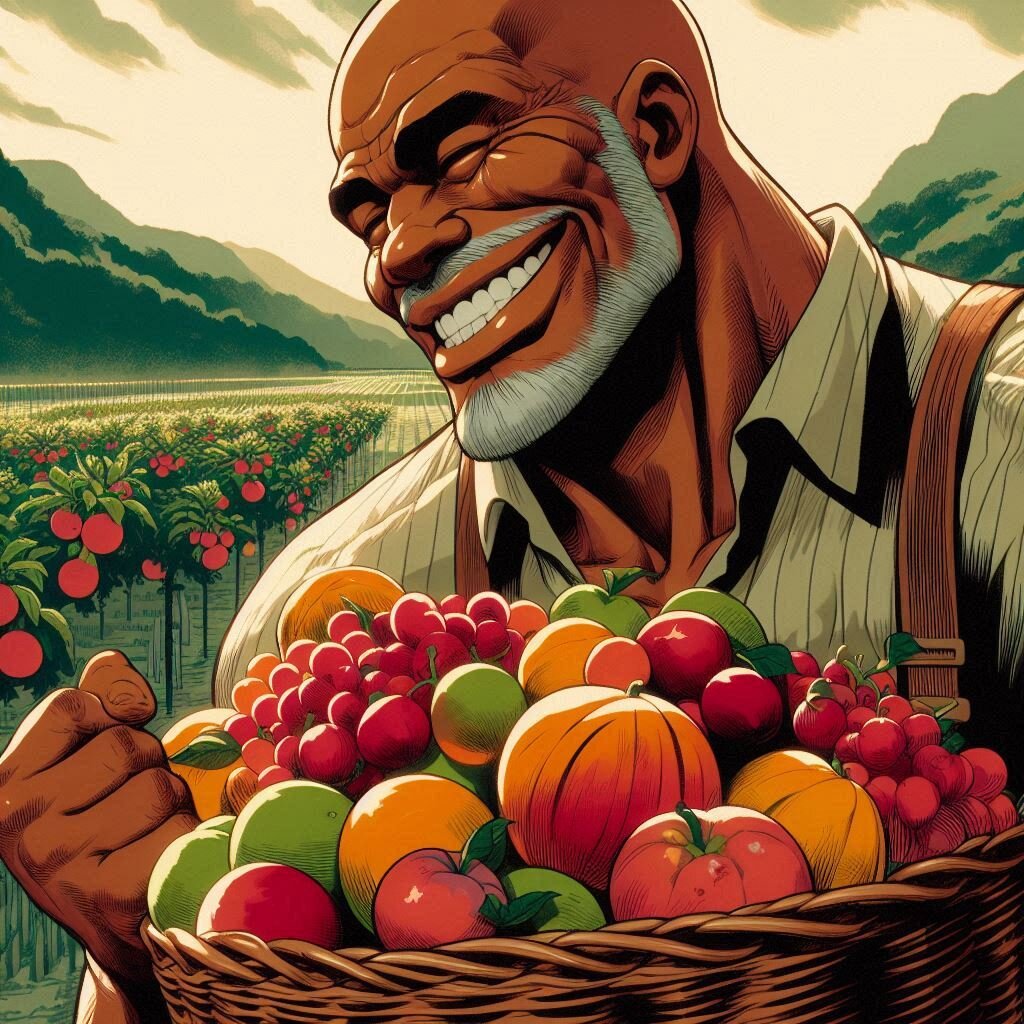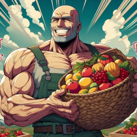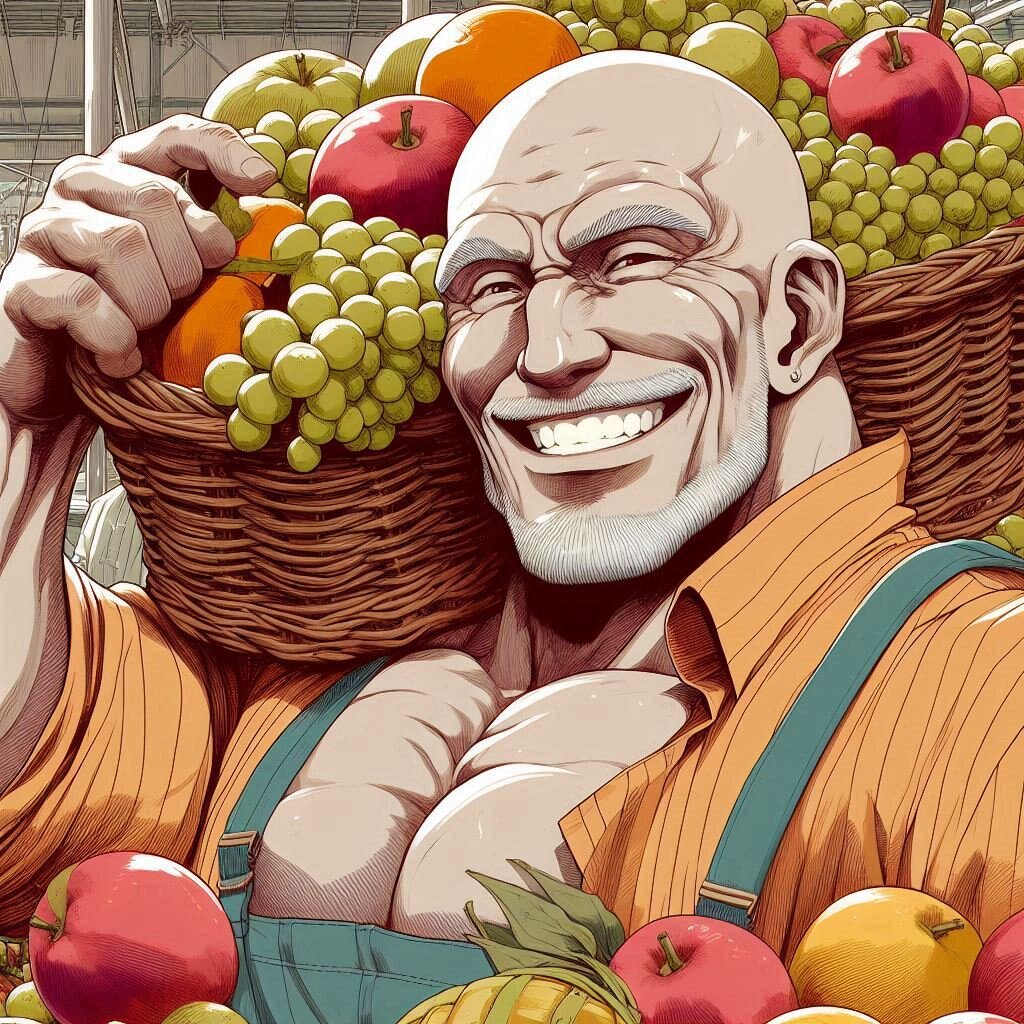 映画のポスターの様なイラスト。映画のラストシーンの様なダイナミックな構図と情景。オフィシャルアート。 日本のアニメの画風の渋いキャラ。ハゲ頭でマッチョの老人は、フルーツ農園で収穫した沢山のフルーツ抱きかかえて満面の笑み。