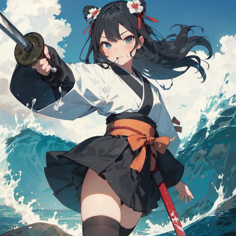 masterpiece, best quality, 1girl, battle mode, knee socks, (((((Standing on 1 black rock in the sea))))), standing firm with legs spread apart, kawaii, glare at, Mouth closed in a straight line, Samurai, holding 1 ultra long Japanese sword by right hand, grasp a bundle of swords, raise a sword, beautiful Japanese sword brim, splashing waves, sheet of spray in the background, blue sky, shinning sun, close up the girl,good finger