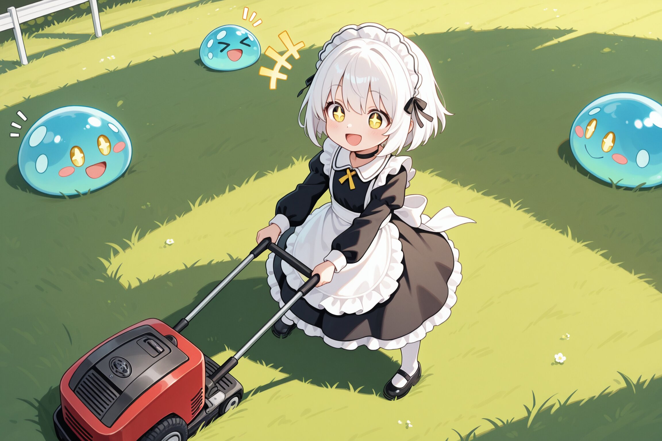 1 little girl, solo, diagonal angle, masterpiece, best quality, amazing quality, very aesthetic, white hair, short hair, yellow eyes, +_+, smile, open mouth, smile, cheerful, +++, notice lines, choker, maid outfit, mowing the lawn, the lawn mower, the lawn, slime, >_<,