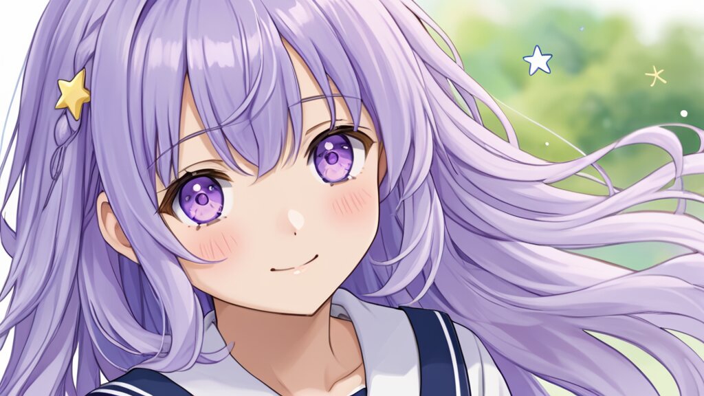 1girl, soft anime face, teenage, pastel purple hair, light blue inner hair, fluffy long hair, loosely wavy hair, soft flowing hair, straight-cut bangs, star-shaped hairpin, calm violet eyes, navy blue sailor uniform, light cardigan