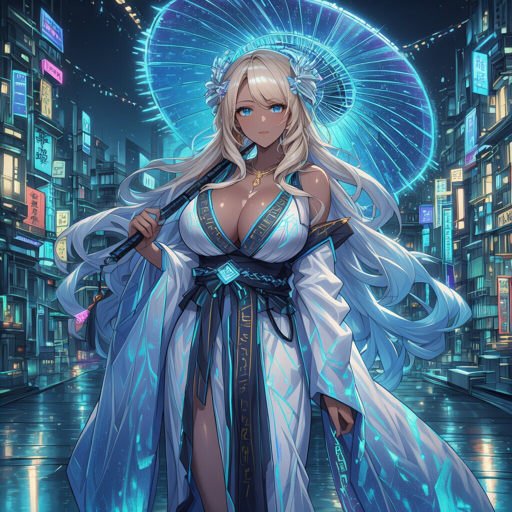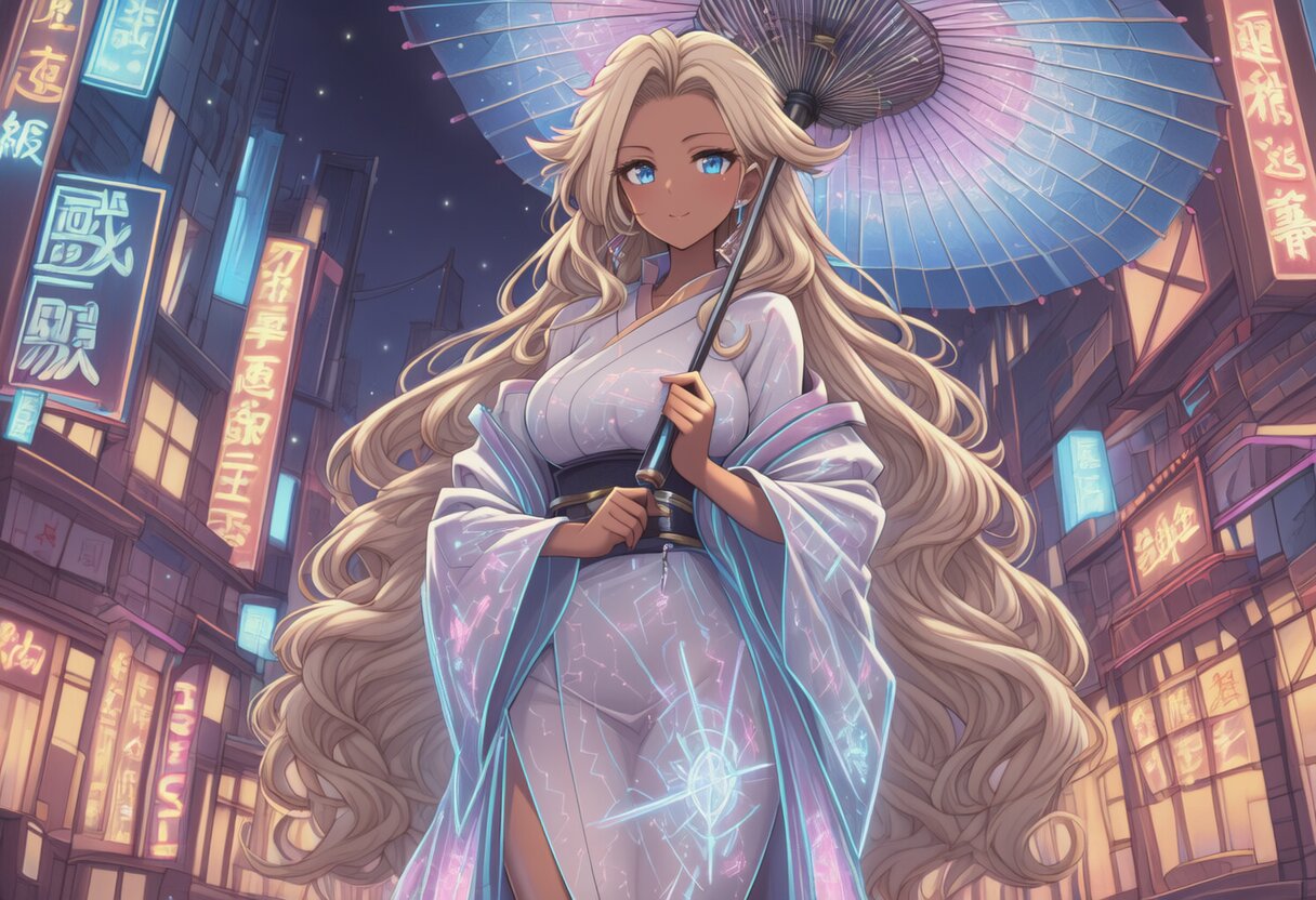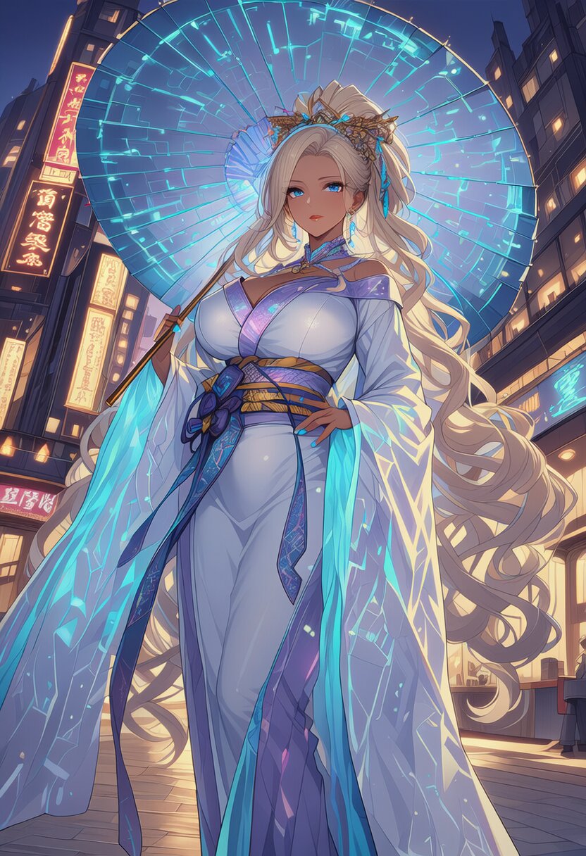 {{{highly detailed}}}, {{{interspecies}}}, {{{beautiful detailed}}}, style of ai-generated, 1girl, solo, {{{dark skin}}}, blue eyes, blonde hair, wavy curly hair, very long hair, large breasts, {{white kimono}}, a cyberpunk-style geisha in a glowing neon kimono with intricate holographic patterns, she holds a futuristic umbrella with led lights and stands on a night sky street surrounded by glowing billboards with chinese characters written on them, the ambience is filled with lights and bright neon, traditional japanese elegance and high-tech futuristic the atmosphere is a fusion of traditional japanese elegance and high-tech futurism, {{{masterpiece}}}, {{{best quality}}}, {{{very aesthetic}}}, {{{ultra-detailed}}}, {illustration}, {{{extremely detailed}}}, {{{an extremely delicate and beautiful}}}