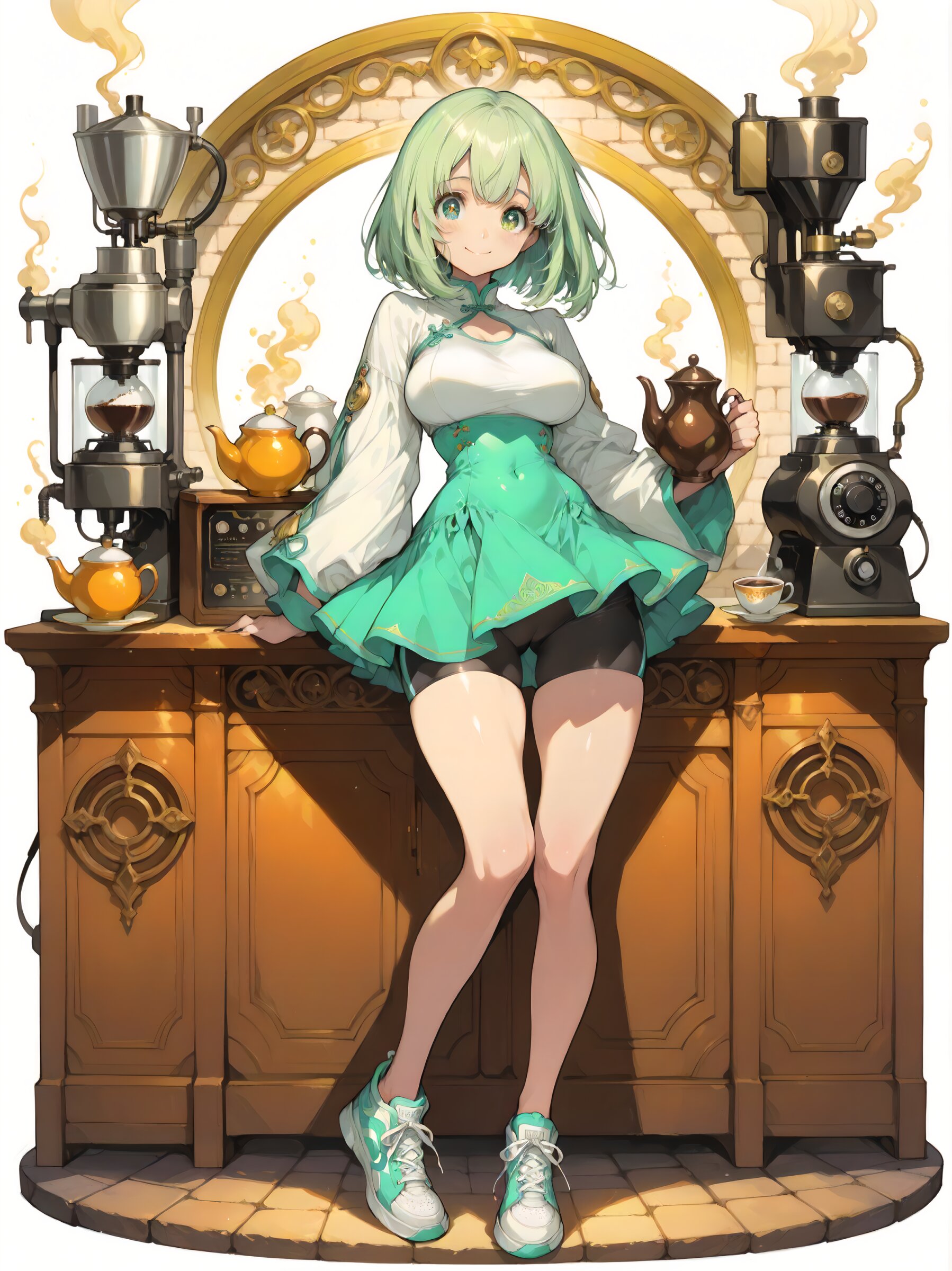 Best quality, Masterpieces, simple background, lots of negative space, anime-style illustration, white background, fine detail, solo, young girl, small body, kawaii, round face, green hair, green eyes, Big eyes, midium breasts, medium hair, shaggy bobbed hair, always calm, world wanderer, Fascinating, shy, ((chunky sneakers)), defined waistline, bike shorts under skirt, bottomless, Lace-up qipao-inspired mini dress with subtle slit, shy smile, carrying a tea set, welcome, content, structured composition, classic brick walls, wrought iron furniture, large vintage coffee machine, old bookshelves, cozy and inviting ambiance, face close-up,