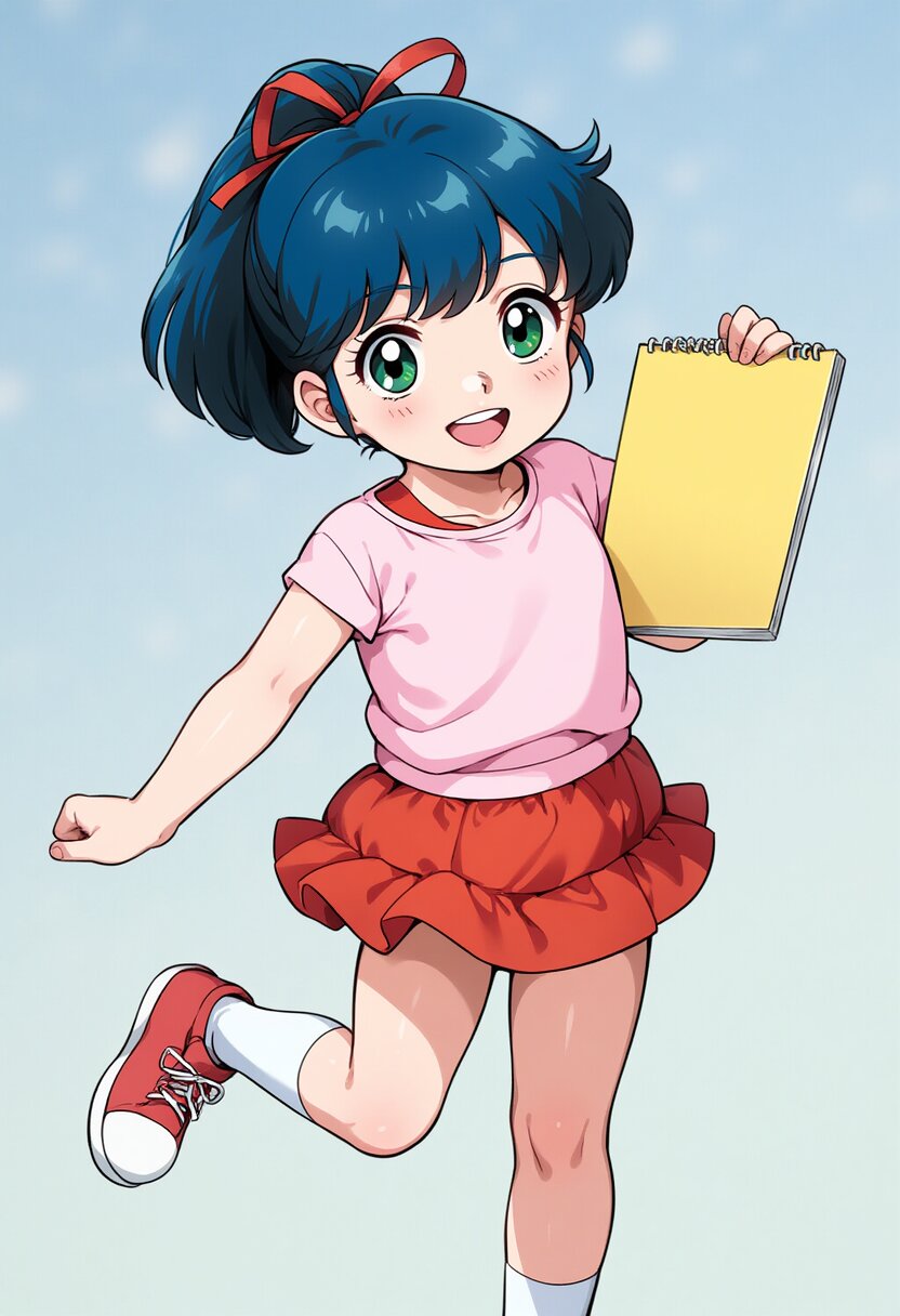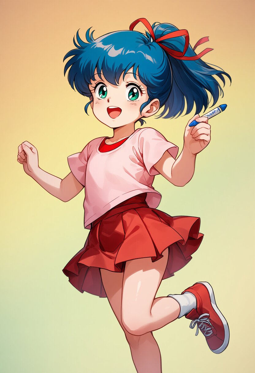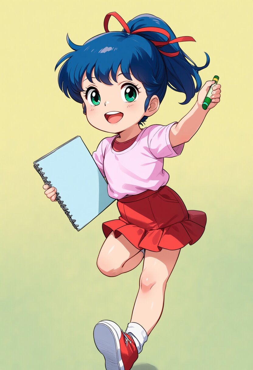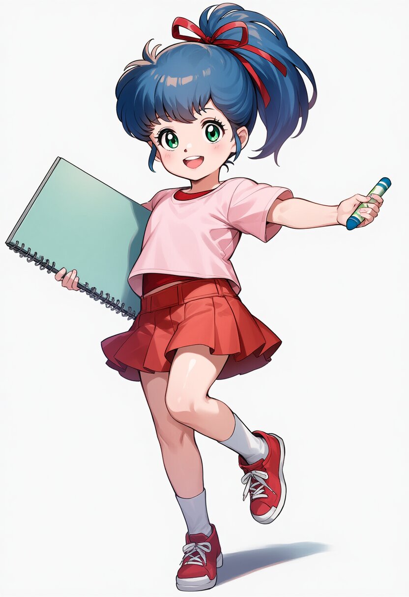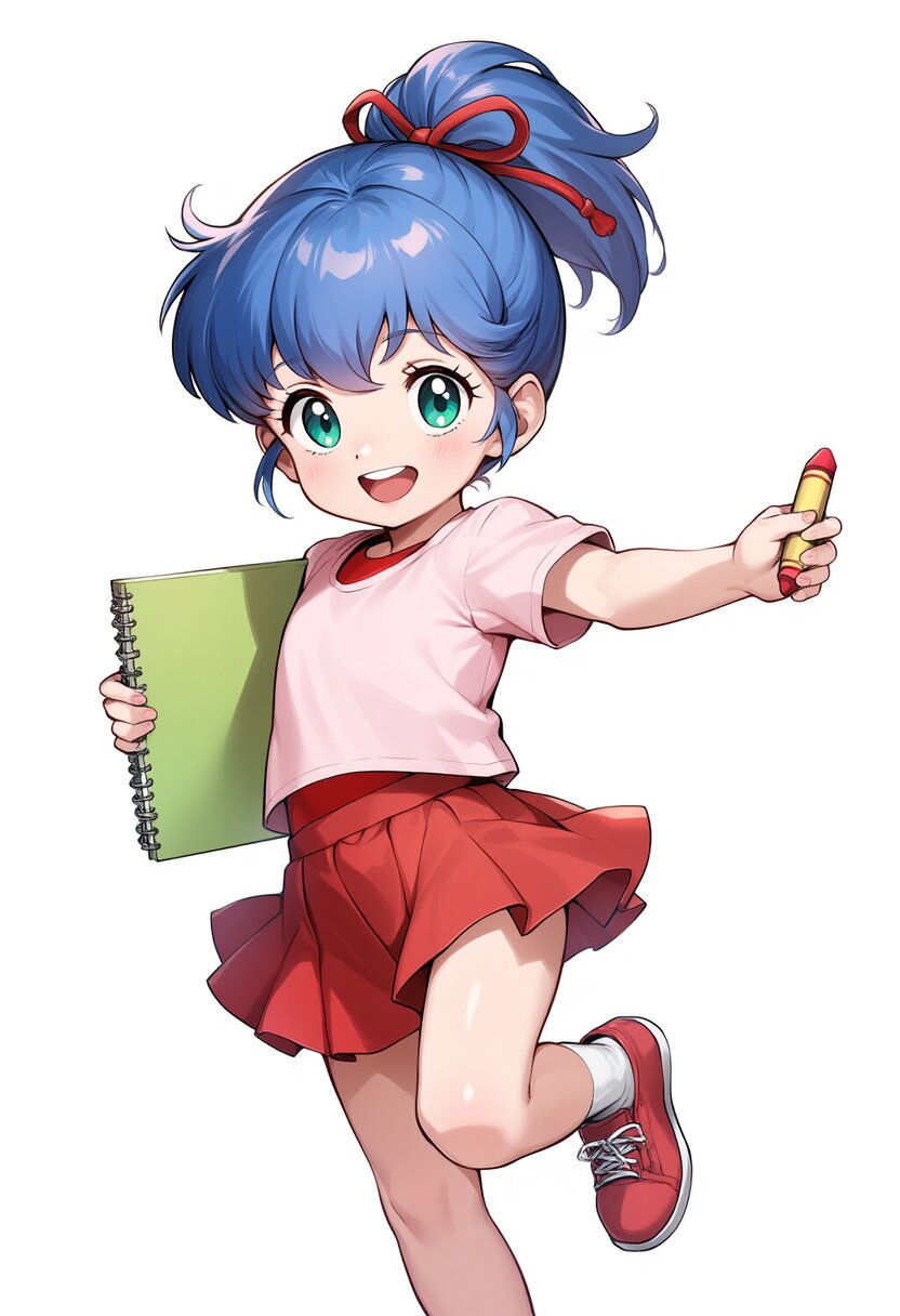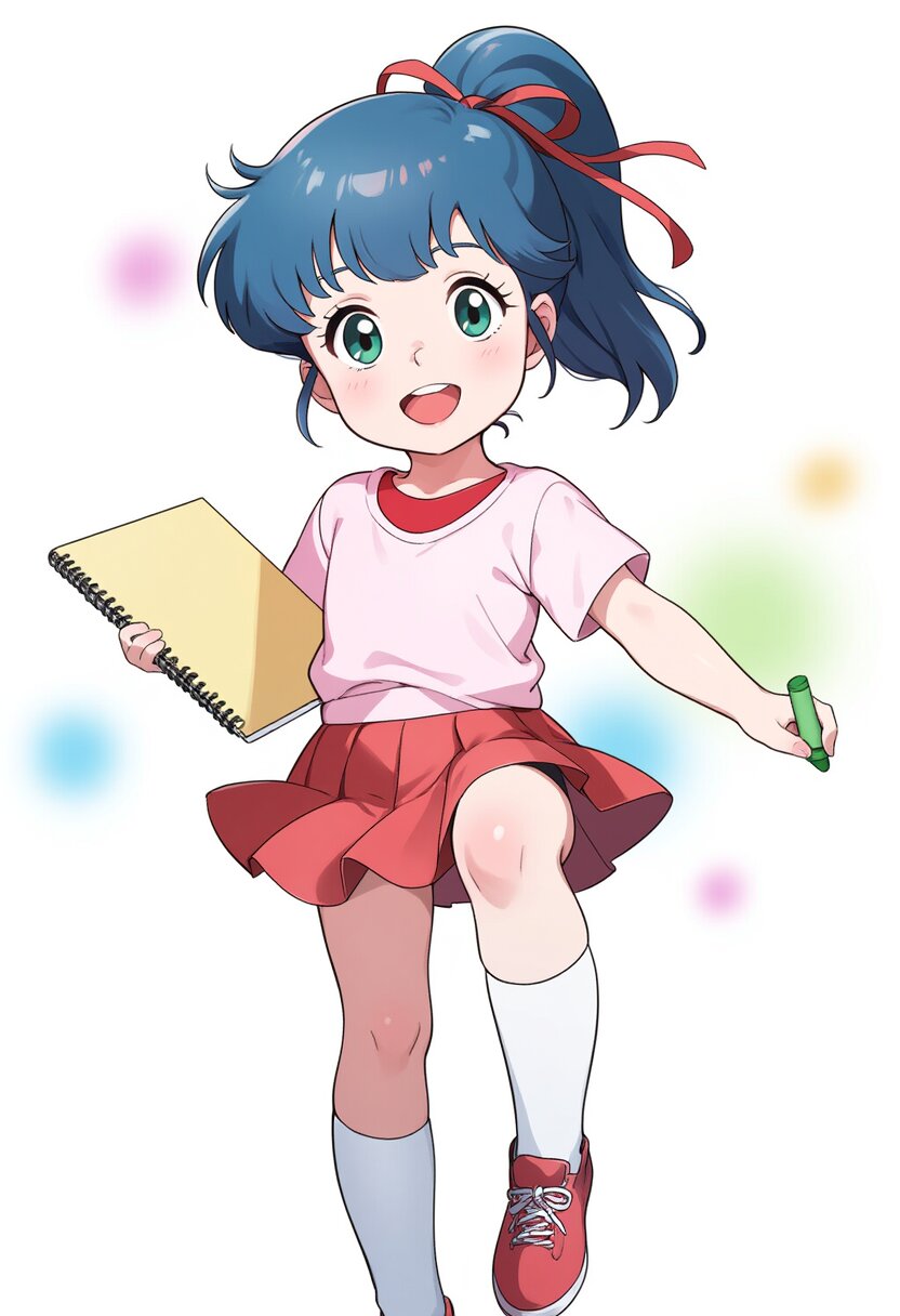 {{{1girl}}},harbor light story,fashion lala,shiny skin, detailed face, Japanese idol, beautiful face,{{retro art style,1980s (style),taste of japanese anime in 1988,game cg,illustration,madeon}}, {{5 years old child,elementary school student,cute,flat chest,very small breasts, toddler body,toddlercon,skinny}}},{{civilian clothes,light pink t-shirt,red tanktop under the t-shirt,red flaired mini skirt,white socks,red sneakers}}}}},{{{big eyes,beautiful detailed eyes,cute eyes,eyelashes,twinkle eyes,emerald eyes}}},{{{{{{blue hair,high pony tail,red string ribbon on head}}}}},{{simply background,blurry background}},looking at viewer,dynamic pose,upper teeth,holding sketchbook,standing on one leg,holding crayon,smile,rating:[general], best quality, amazing quality, very aesthetic, absurdres , no text, best quality, very aesthetic, absurdres