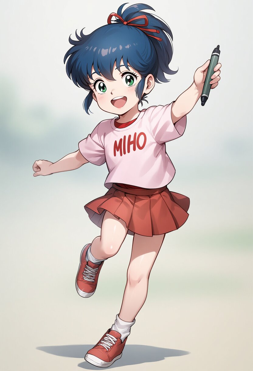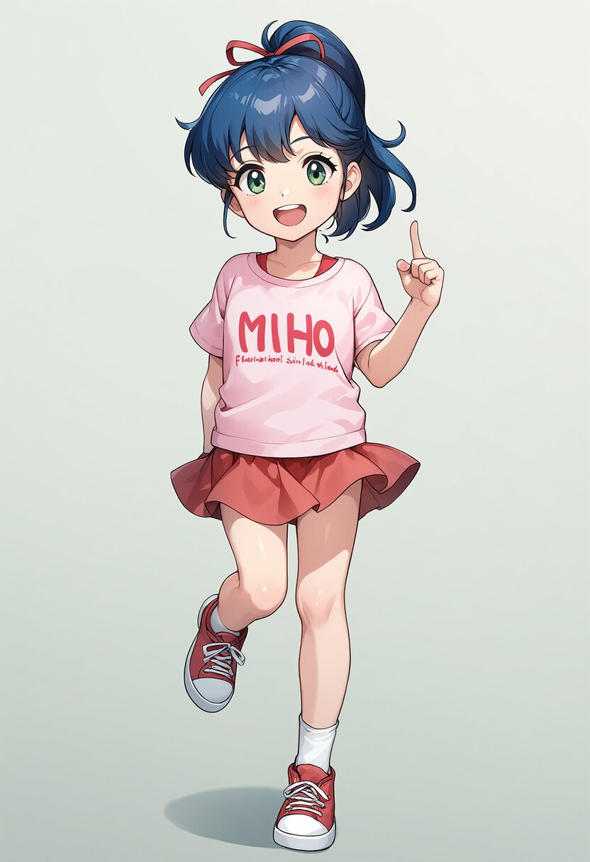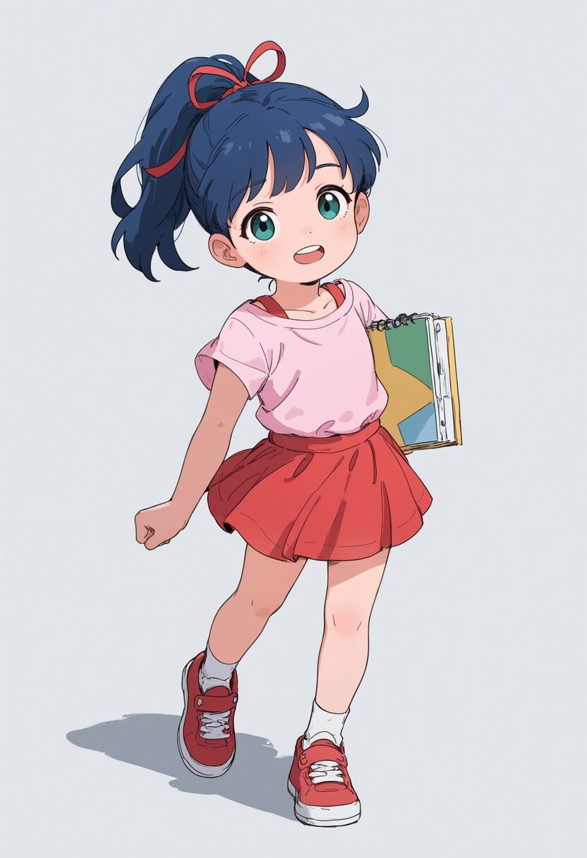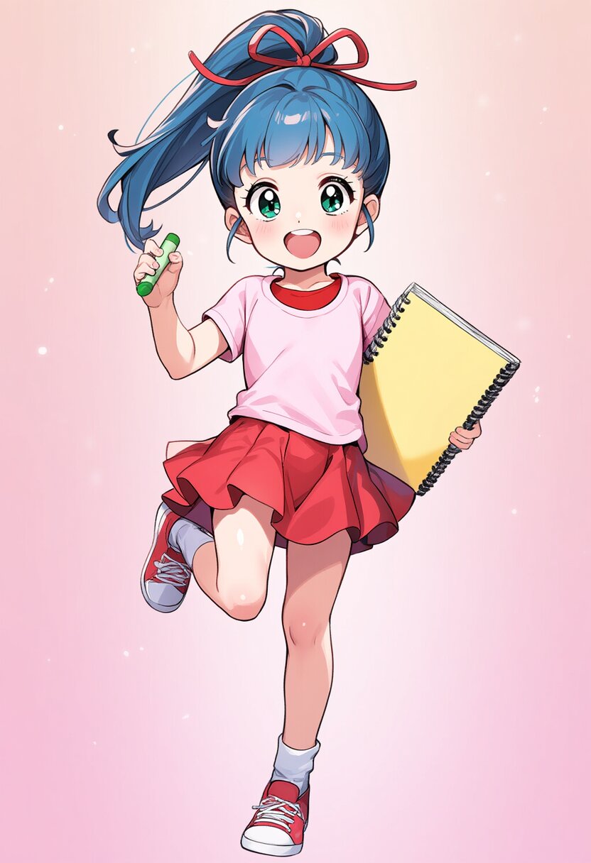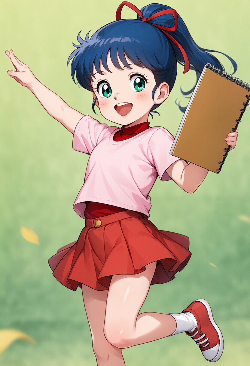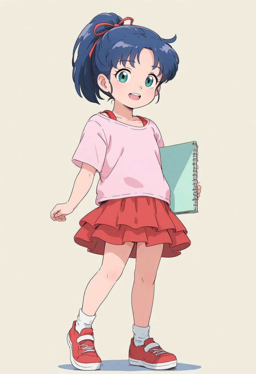 {{{1girl}}},harbor light story,fashion lala,shiny skin, detailed face, Japanese idol, beautiful face,{{retro art style,1980s (style),taste of japanese anime in 1988,game cg,illustration,madeon}}, {{5 years old child,elementary school student,cute,flat chest,very small breasts, toddler body,toddlercon,skinny}}},{{civilian clothes,light pink t-shirt,red tanktop under the t-shirt,red flaired mini skirt,white socks,red sneakers}}}}},{{{big eyes,beautiful detailed eyes,cute eyes,eyelashes,twinkle eyes,emerald eyes}}},{{{{{{blue hair,high pony tail,red string ribbon on head}}}}},{{simply background,blurry background}},looking at viewer,dynamic pose,upper teeth,holding sketchbook,standing on one leg,holding crayon,smile,rating:[general], best quality, amazing quality, very aesthetic, absurdres , no text, best quality, very aesthetic, absurdres