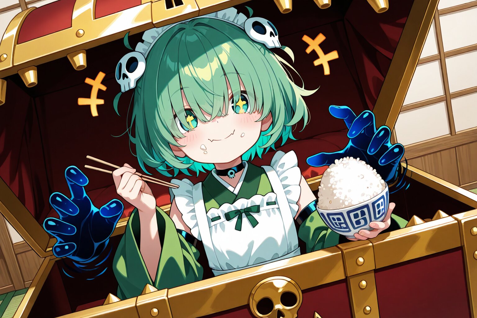 1 little girl, solo, diagonal angle, masterpiece, best quality, amazing quality, very aesthetic, cobalt green hair, short hair, messy hair, (hair over eyes:1.2), green eyes, demon fangs, +_+, closed mouth, smile, cheerful, +++, notice lines, choker, green wa maid outfit, (oversized sleeves:1.2), detached sleeves, (floating black ghosty hands:1.2), skull hair ornament, in mimic chest, holding rice bowl, rice on face, japanese room,