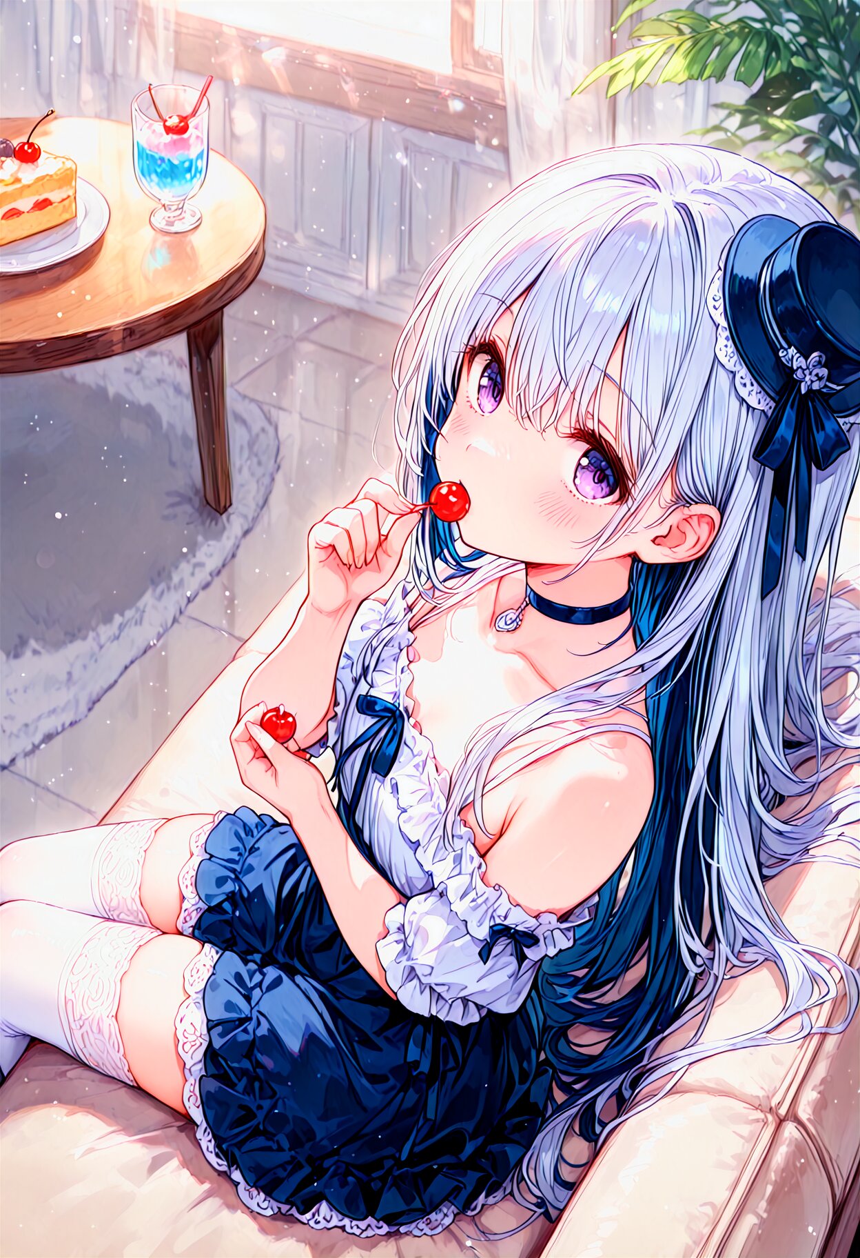 beautiful detailed background, best quality, pale color (watercolor \(medium\):1.1) collarbone, (Expressionless:0.8), big eyes,(half-closed eyes:0.8), tareme, pale purple eyes, thighhighs, (silver hair:1.1), (dark blue hair colored inner hair:0.8), long hair,very long hair, eyebrows visible through hair, white off-shoulder and dark blue skirt, see-through veil, mini hat, (blue strapping ribbon and bow,:0.7) frills, strapping ribbon, choker, round lighting, temptation, eating, (cherry,:1.3) from above, from side, looking up, profile, (looking at viewer,:0.8) (open mouth,:0.6) table, on couch, <lora:clear:-2.0> <lora:noline-16oa:-1.1> <lora:sdxl-shadow_01:-0.7> <lora:sdxl2-flat2-512b:-0.5>