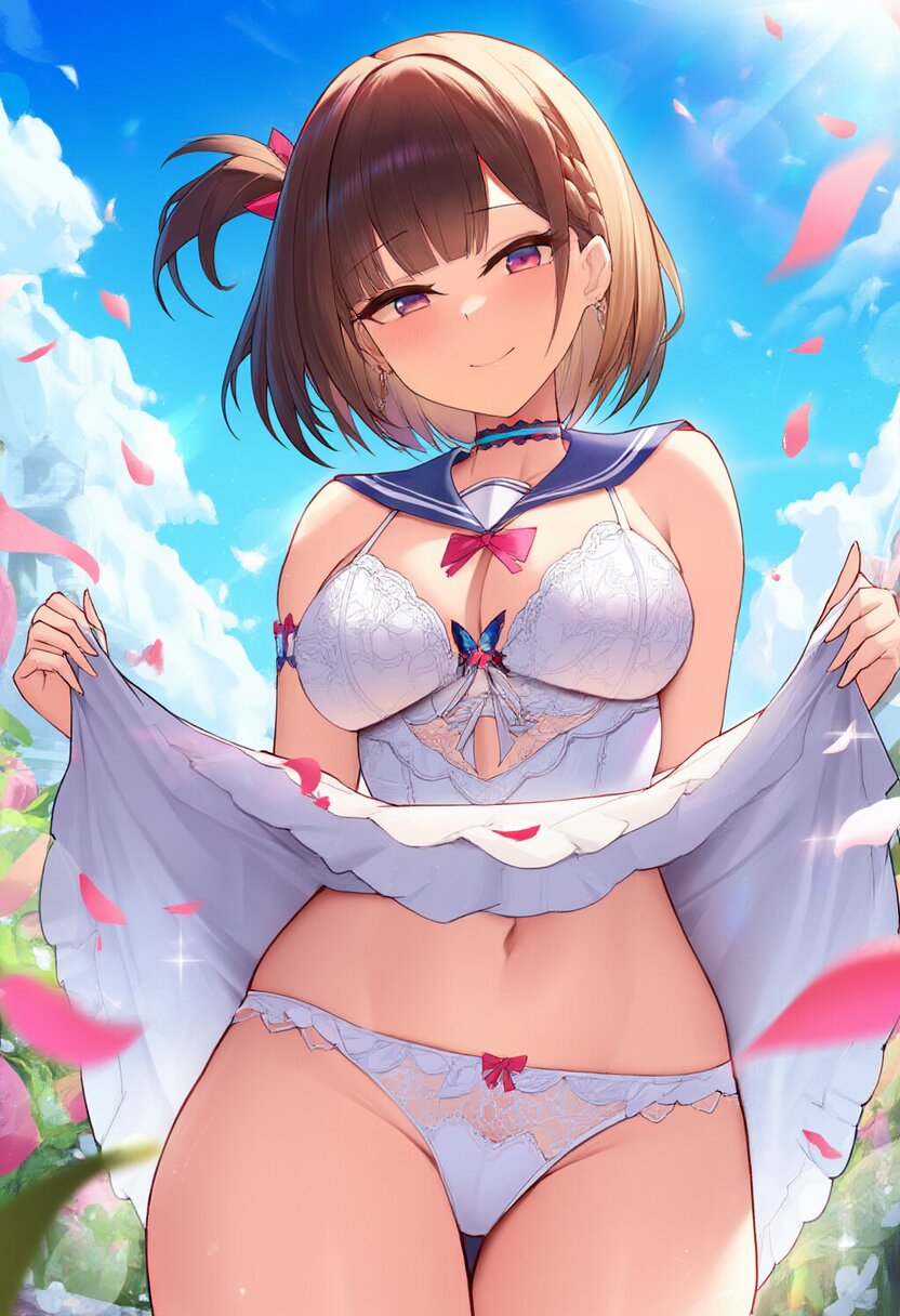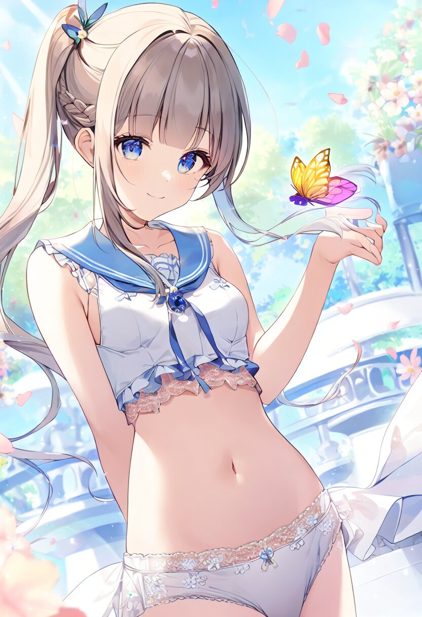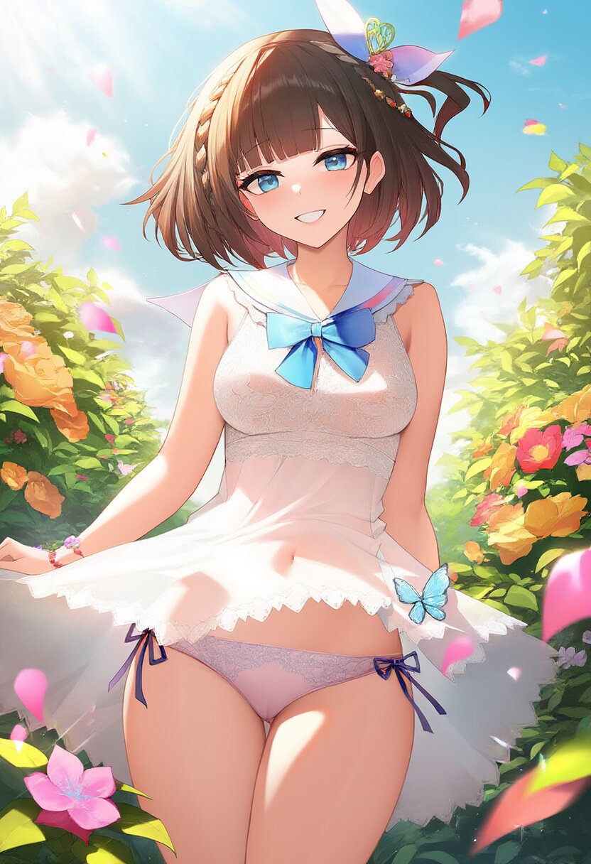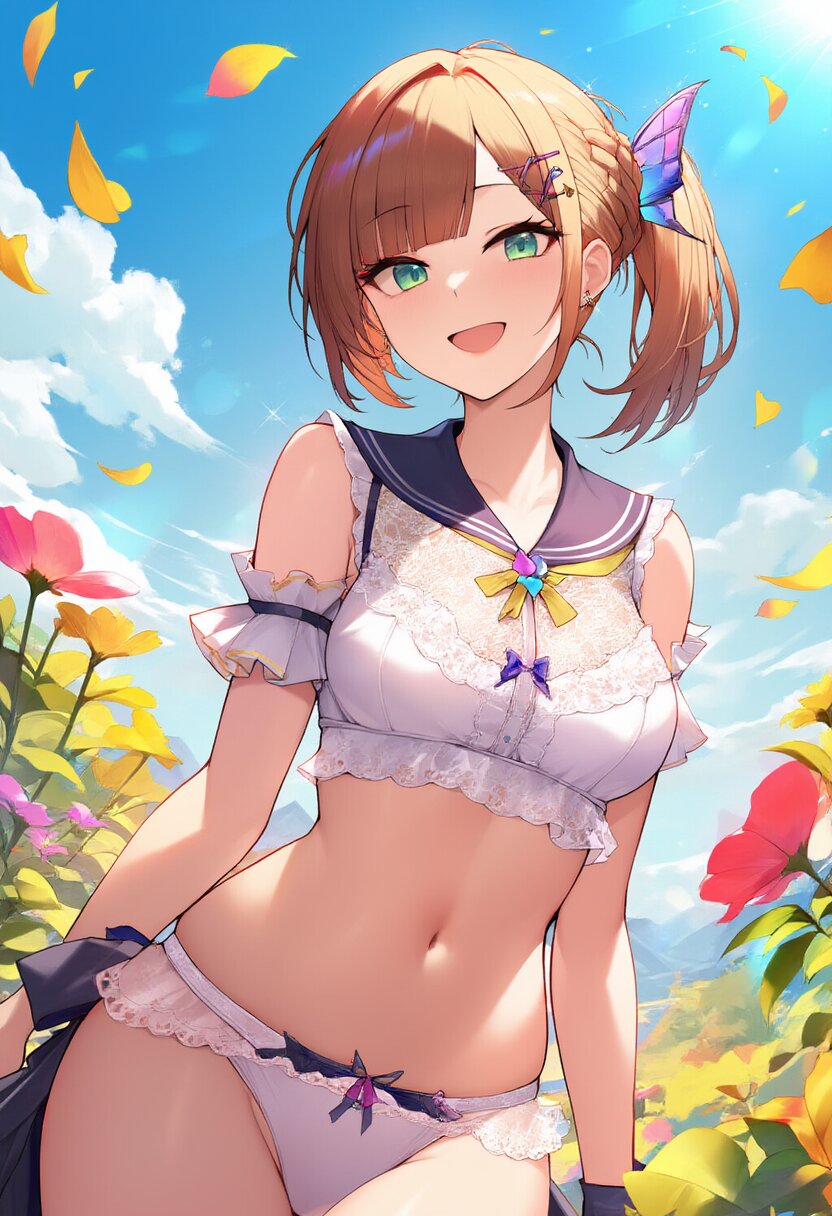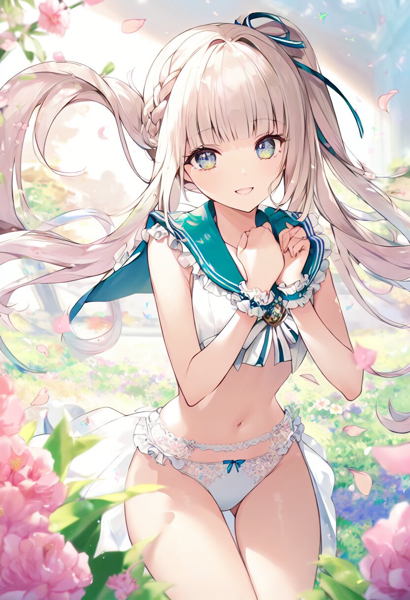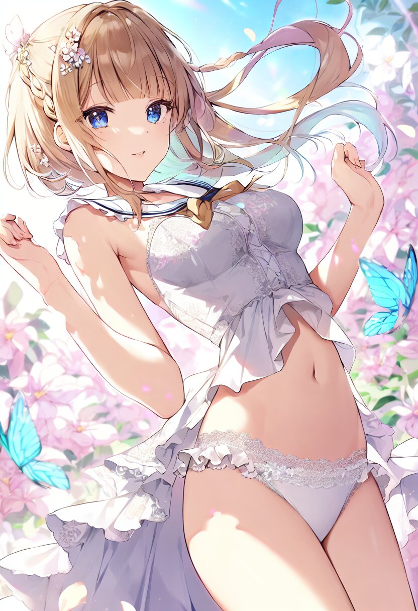 "Enchanted Garden Goddess" - Imagine a captivating AI illustration of a girl in a magical garden, wearing delicate lace lingerie adorned with ribbons and butterflies. She exudes confidence amidst floating petals and sunlight, her attire boasting frills, lace, and a sailor collar. Adorned with colorful accessories, her eyes sparkle with joy amidst blooming flowers, embodying the essence of beauty and allure... official art, {{ultra-detailed}}, {{high resolution}}, dynamic fuzziness, colorful, best quality, cowboy shot, underwear, girl ,solo, 20 years old, beautiful detailed hair, beautiful detailed eyes, blunt bangs, braid hair, twintail, side ponytail, bob, Shostakovich, hypermaximalist, super detailed, {{{{amazing quality, great quality, high quality, very aesthetic,, best quality}}}}, rating:general, best quality, very aesthetic, absurdres