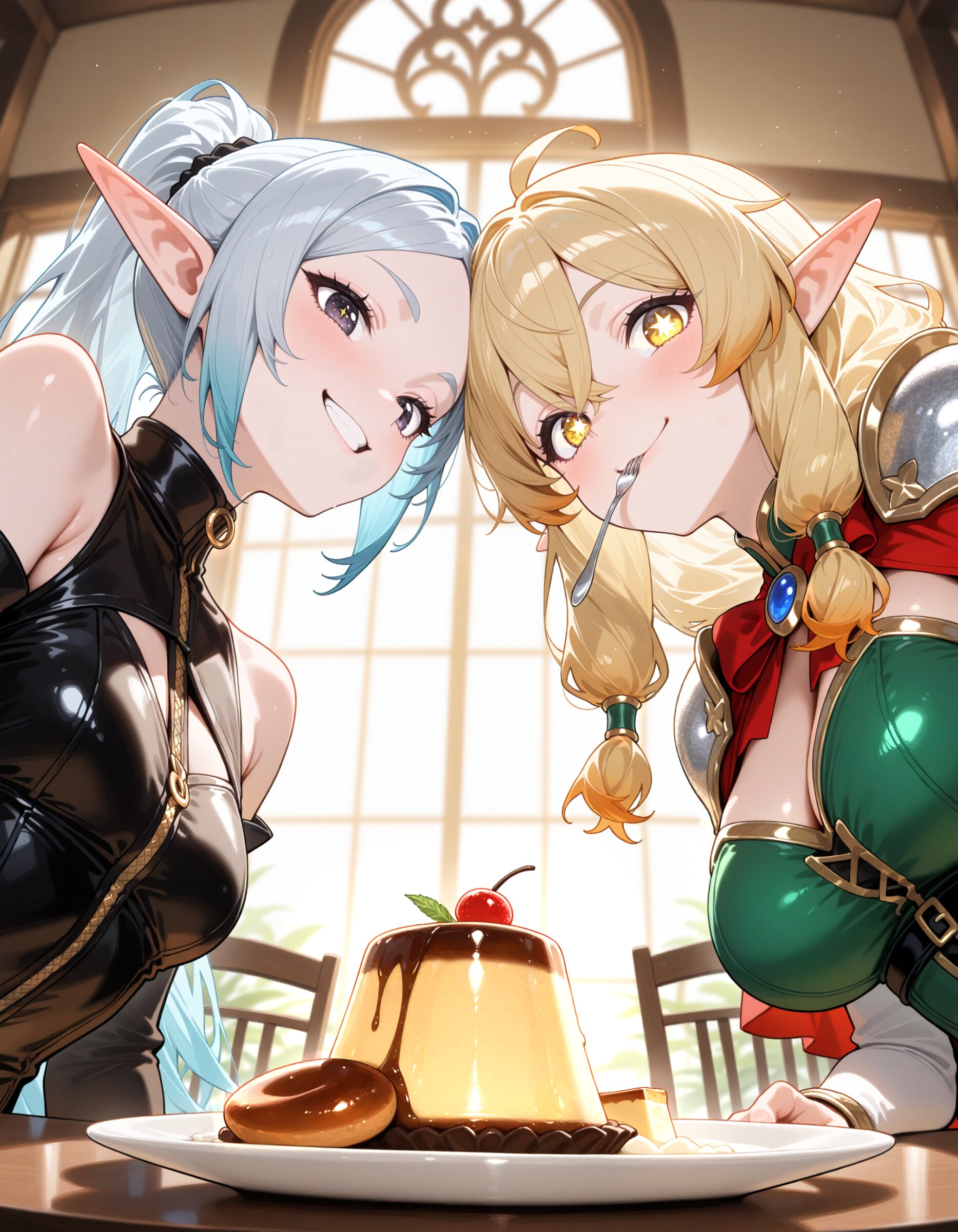 multiple girls, 2girls, (elf girls:1.2), , having a drinking party at a restaurant. (In addition to tables, the restaurant offers a well-appointed counter (well-appointed:1.0), making it comfortable for solo diners (suitable for solo lunch:1.0) The decor is unified in a wood theme (wood:1.0), creating an interior that shines with an antique yet high-sense style antique yet high-sense:1.0). Please show their joyous expressions and the sense of camaraderie between them,, (noon:1.0), soft natural sunlight, ((close up:1.0), heads together:1.1), , from below, dutch angle, , perfect anatomy, , with fork ,spoon, , eating falafel on plate, pudding on glass, , prawn salad on plate, professional anime art lots of details, , overexposure, shiny-glistening, (watercolor style:0.7), (pastel color style:1.2) you can add scenery, (volumetric lighting), To make the background more distinctive. super fine concept art, hard surface, 8K, unreal engine, masterpiece, best quality, amazing quality, very aesthetic, absurdres, newest, ambient occlusion, raytracing, <lora:noline (1):-0.5> <lora:sdxl2-flat2-512b:0.15> <lora:facelightup_xl_v10:0.5> ((close up:1.0), heads together:1.1), , from below, dutch angle beautiful elf girls sitting on claw-footed chair,(pale skin:1.0), chest length hair, high ponytail forehead , fine hair, insanely beautiful black eyes, first-rate female bodies, voluptuous body, flat breasts, wide hips, (embarrassed:1.0), (drunkard, happy:1.0), ,, heterochromia, biting, (smirk:1.2), fantasy wizard holding magic wand leather cuirass gloves cloak, sleeveless, looking at another, detached sleeves dynamic lighting, sunlighting, warm sunlight, (perfect anatomy:1.2), cute girls, extremely detailed, perfect face, perfect eyes, (depth of field),warm, Comfy, Soft Lighting, shiny smile smile a little,,, falafel on plate, (holding cutlery:1.0), cutlery on the table, glass of water,文字数制限により省略