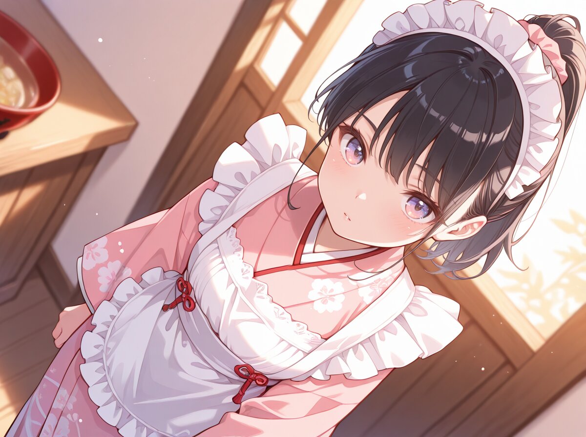 1girl, (16YO:1.4), classic japanese style waitress, apron, black hair, ponytail, portrait , from front , front shot , BREAK (masterpiece:1.5),8k,4k,best quality, very aesthetic, ultra-detailed:1.8, (pastel colors:1.5), (game CG:1.2), (Smooth skin), (ultra highres), (Extremely detailed face),(Extremely detailed eyes), (cute:1.5), (depth of field:1.3), (soft-edged:1.2), (soft lines:1.2) (ambient light:1.2), (bloom:1.3) (high brightness, high saturation, soft contrast:1.3), (erotic atmosphere:1.5), <lora:detailed_notrigger:1> <lora:Expressive_H:1>, <lora:privet-part:1>
