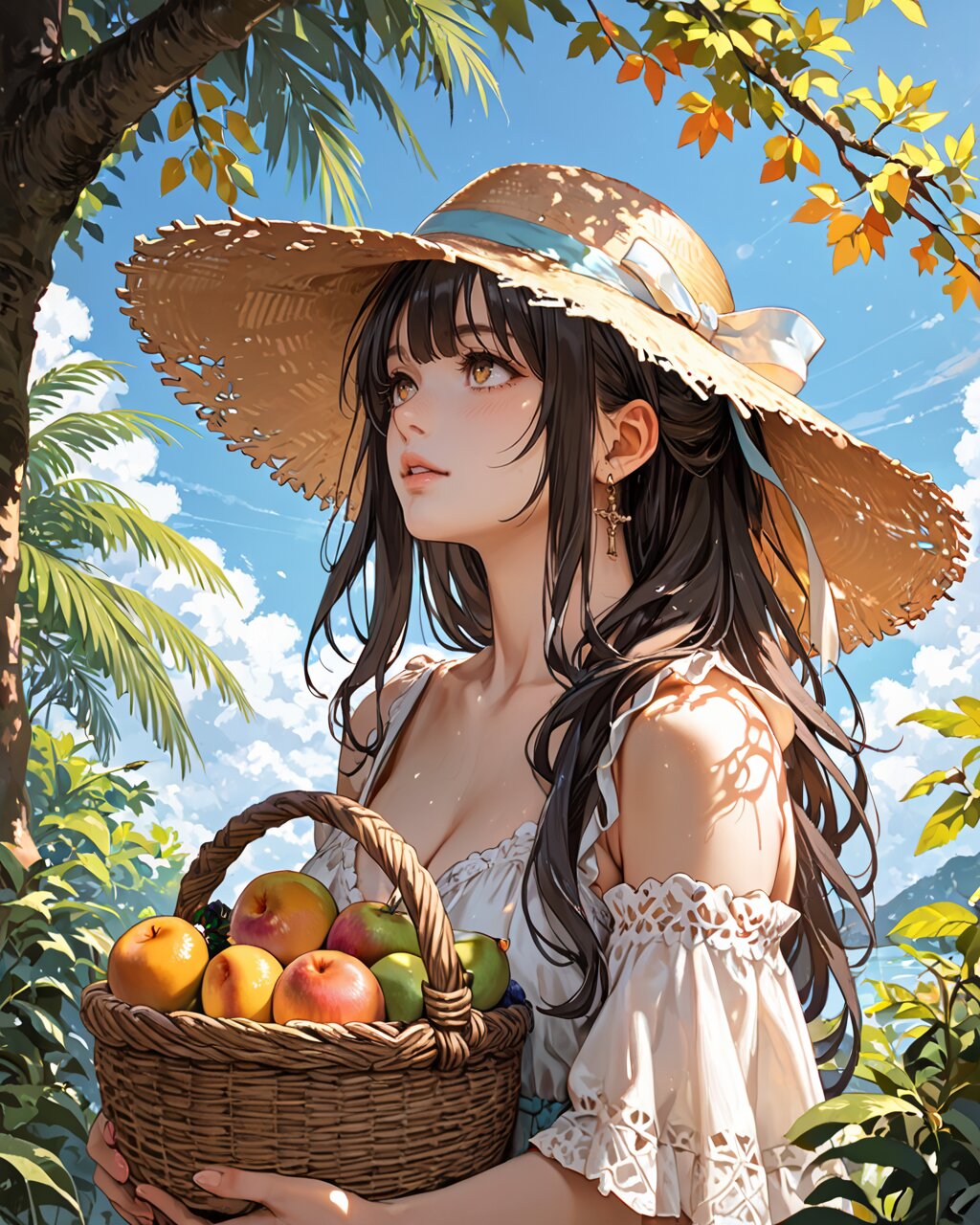 score_9, score_8_up, score_7_up,rate_safe,raw lighting,quality_masterpiece,quality_detailed BREAK A girl holding a fruit basket. Straw hat. Blue sky. Looking up.