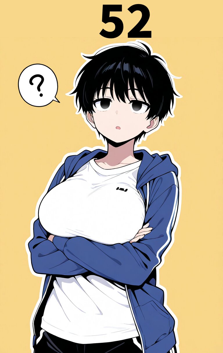 1girl,tomboy,(large breasts),slim,curvy,(wide hips),black hair,short hair,tareme,(sanpaku),black eyes,empty eyes,black eyebrows,expressionless,unemotional,open mouth,blue hooded jacket,open jacket,white T-shirt,black shorts,gym shorts,standing,crossed arms,arms under breasts,spoken question mark,white outline,yellow background,hair shade,upturned eyes,looking up,looking ahead,upper body,from front,straight-on,((high contrast)),(stylized),(kawaii),(anime coloring),(cute),gddw,((correct_anatomy)),flat color