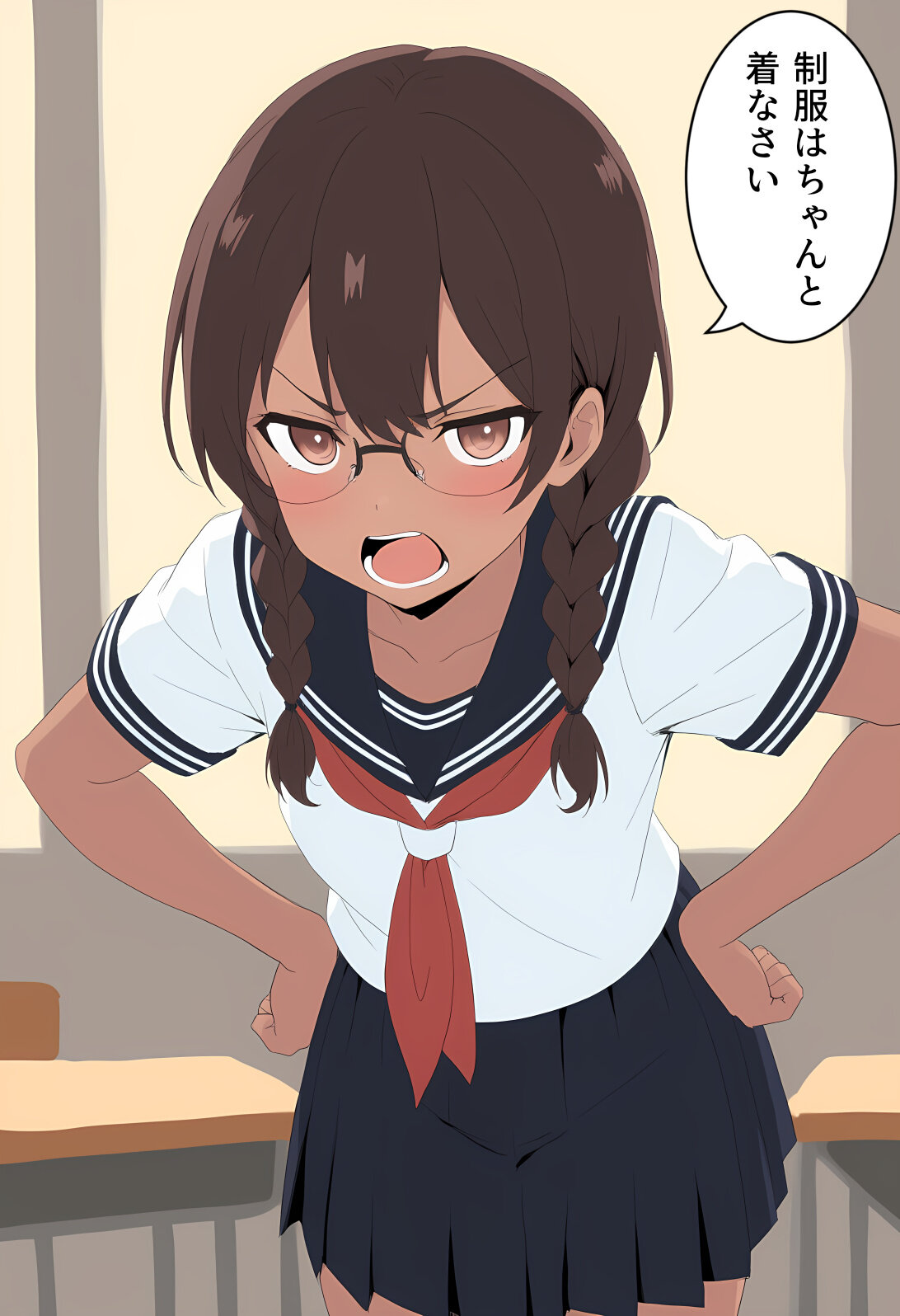 1girl, [[[flat color]]], oekaki, motion lines, [[[comic sign]]], {detailed background}, classroom , no text, best quality, very aesthetic, absurdres| girl, dark skin, glasses, small breasts, brown hair, braids, angry, hands on hip, school uniform, upper body, leaning forward 1girl, nsfw, [[[flat color]]], oekaki, motion lines, [[[comic sign]]], {detailed background}, room , no text, best quality, very aesthetic, absurdres| girl, dark skin, glasses, small breasts, brown hair, braids, lie on floor, bra lift, undone bra, panties, laughing, reading