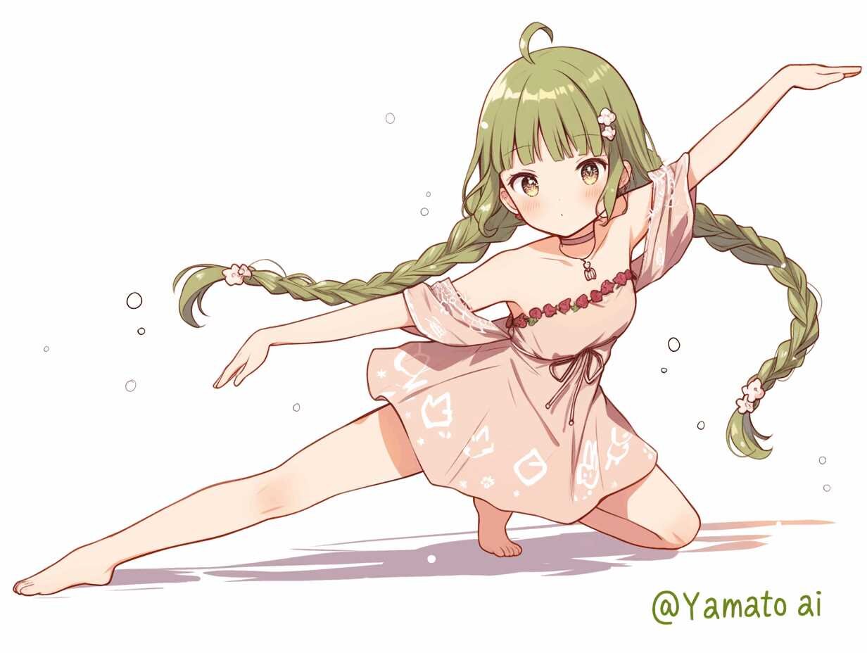 Top quality, action, cute, beautiful, attractive, intelligent, curious woman (green hair in two braids (ribbon), long fringe, glossy, big beautiful light brown eyes (droopy, sparkling eyes), flower ornament, neck choker with “m's” and silver ornament), cute one-piece dress (pink base tone, off-shoulder, vermilion embroidery), pretty dancing, white background, cartoonishly beautiful face, full body (no excess limbs, no missing limbs)