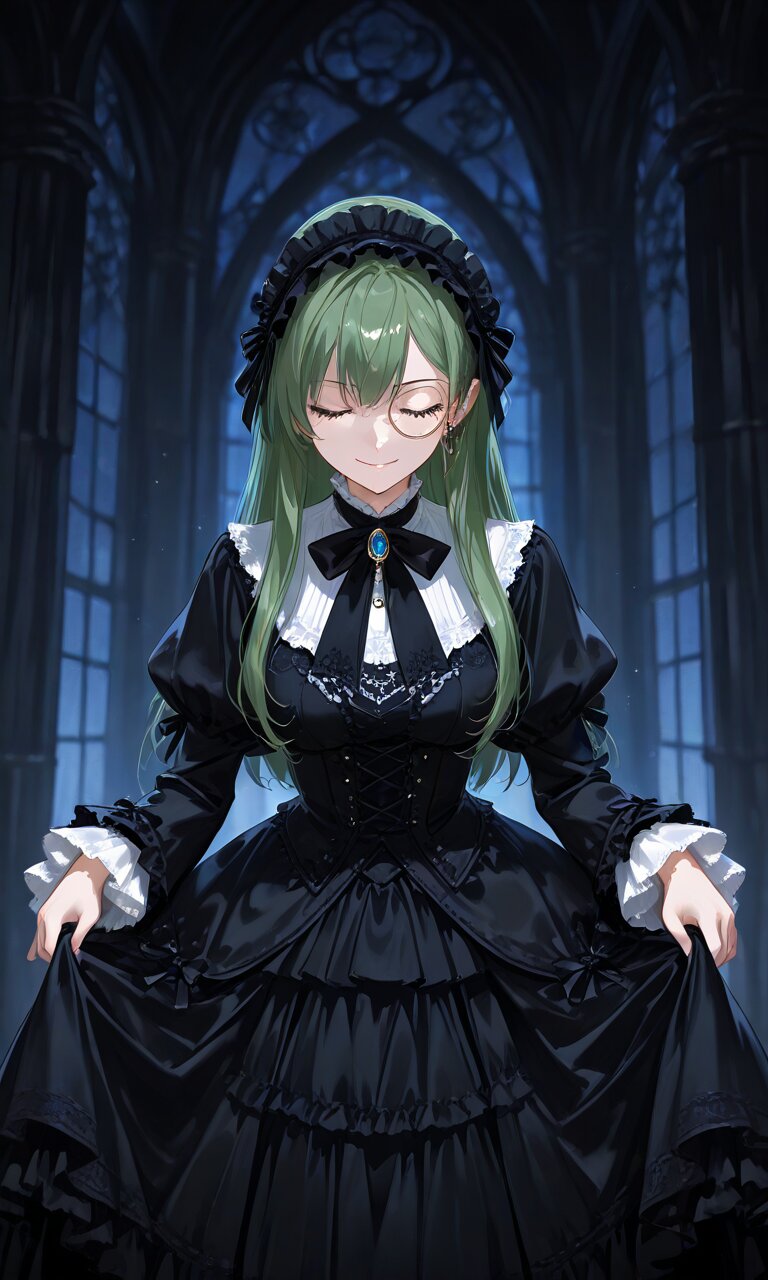 1 lady, long hair, green hair,((monocle)), (gothic lolita, black cloth),, ,seductive smile, cowboy shot, night,standing, (curtsey, bowing, closed eyes),