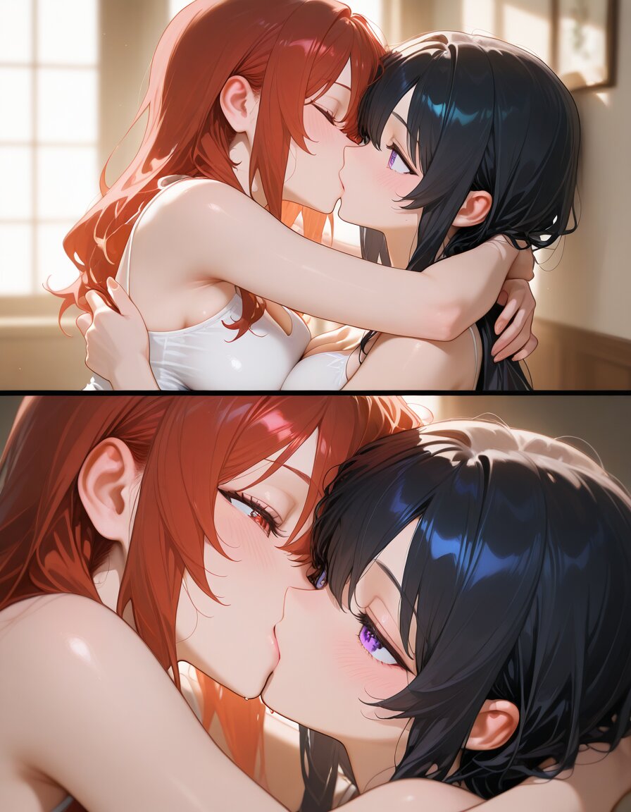 2girls, sensitive, 2koma, (beautiful eyes, detailed eyes), comic, hug, kiss, masterpiece, best quality, amazing quality,