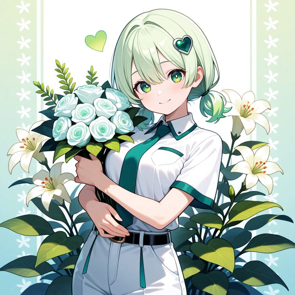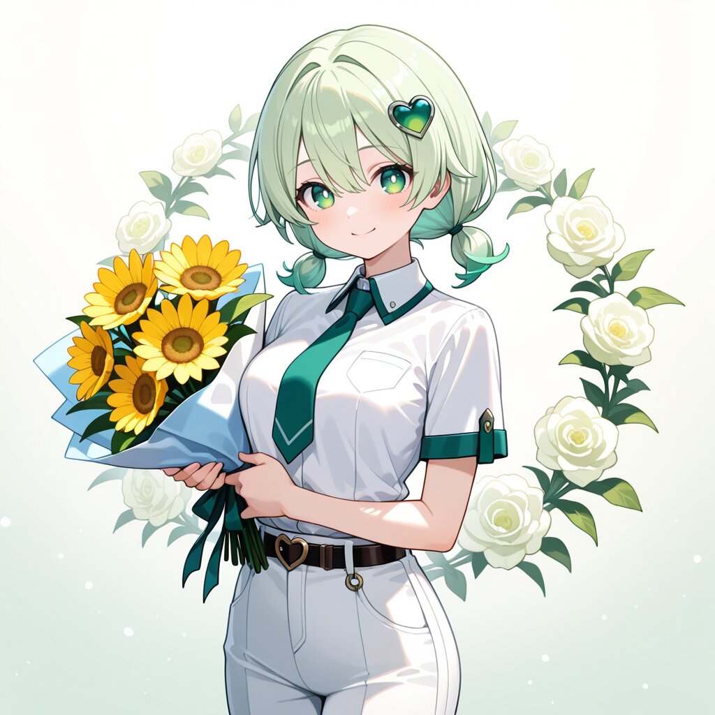 masterpiece,best quality,highres,highly detailed,detailed eyes,general,1girl,solo,cute,light green hair,short hair,short twintails,low twintails,a green hair ornament,a heart-shaped hair ornament,,green eyes,medium breasts,smile,short sleeves,white blouse,green necktie,long white pants,belt,slender girl,cowboy shot,holding large bouquet,flower background,bright background,