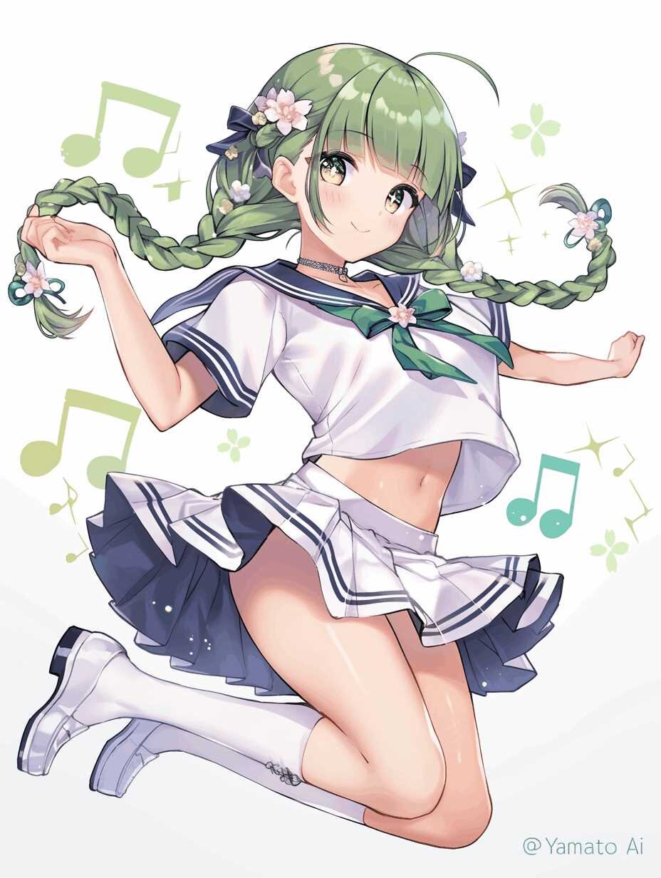 Top quality, action, cute, beautiful, attractive, intelligent, curious woman with Latin dancing (green hair in two braids (ribbon), long fringe, glossy, big beautiful light brown eyes (droopy eyes, sparkling eyes), flower ornament, neck choker with “m's” and silver ornament), cute sailor suit, cute dancing, white background, cartoonishly beautiful face, full body (no excess limbs, no missing limbs)