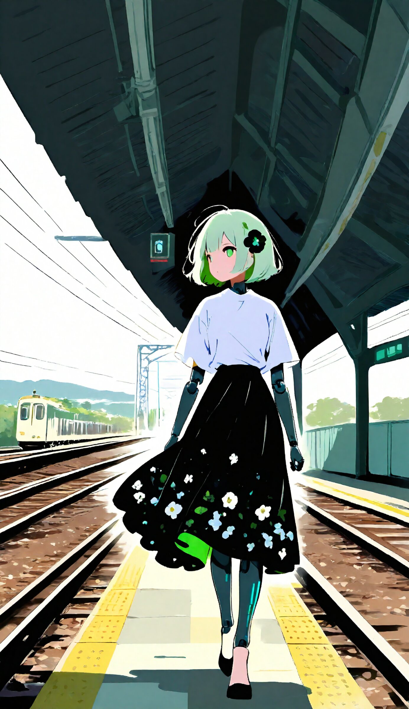 (masterpiece, best quality), amazing quality, very aesthetic, absurdres, highres, newest , minimalist style, no lines, Minimalism, 1girl, walking,full_body,looking to the side,expressionless, android,short sleeves, short hair,light green hair, hair ornaments, black flower ornaments,glowing lines, beautiful detailed eyes, white shirt,(black skirt),long skirt,floral skirt,white flowers,black high_heels, robot joints,(white mechanical arms), outdoor, building, scenery, train, train station, railroad tracks