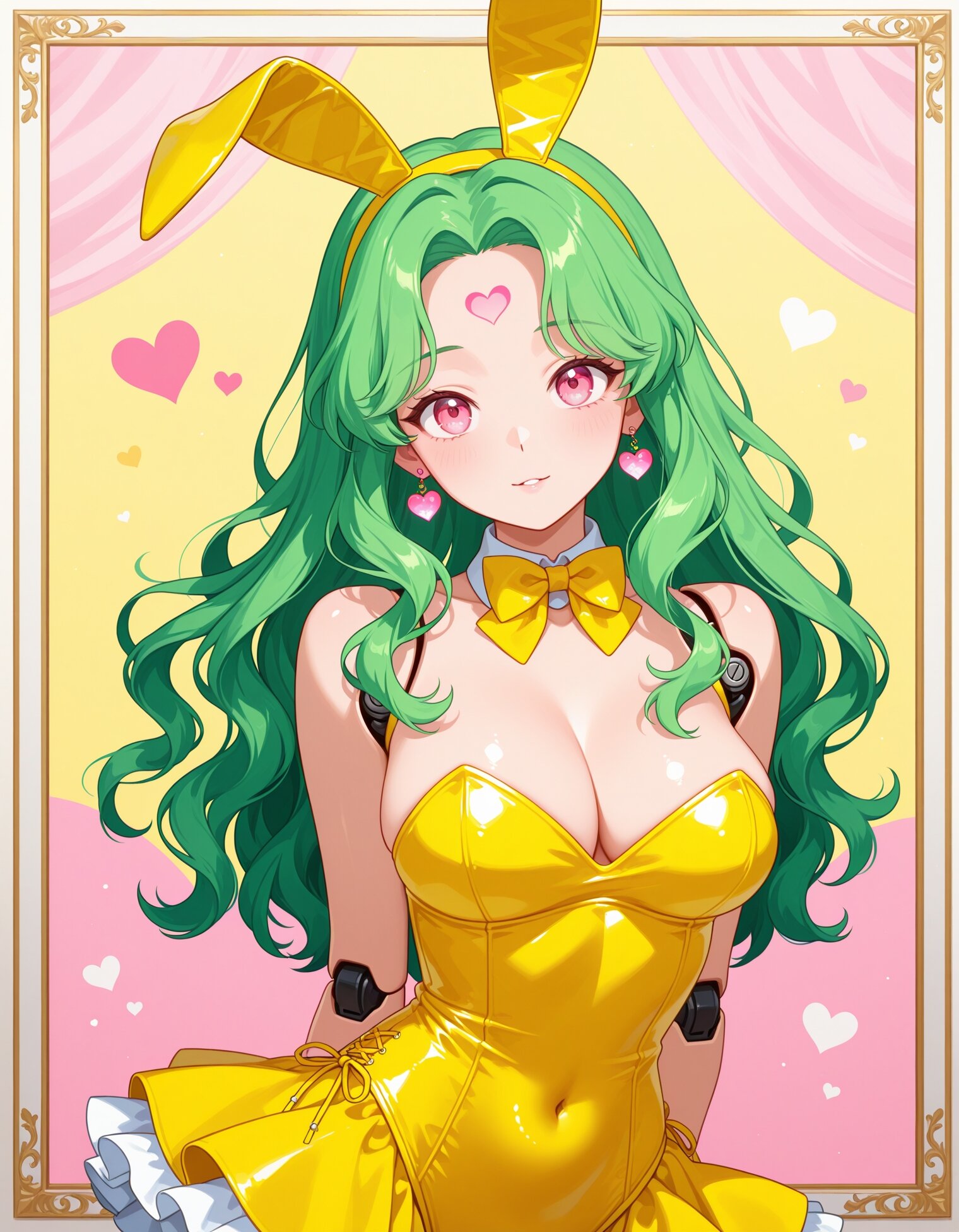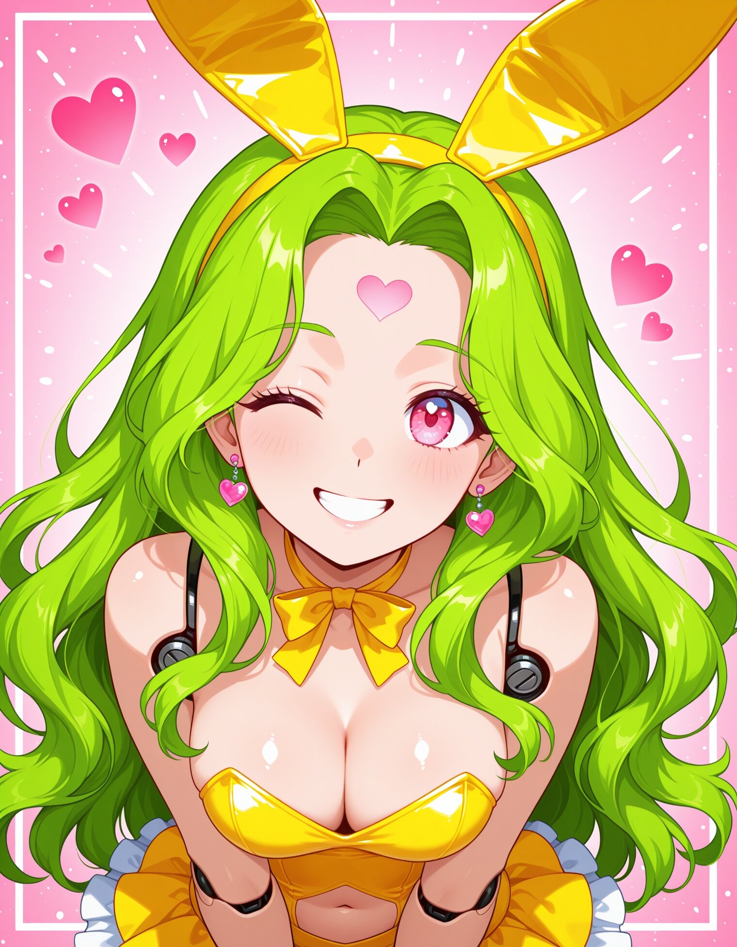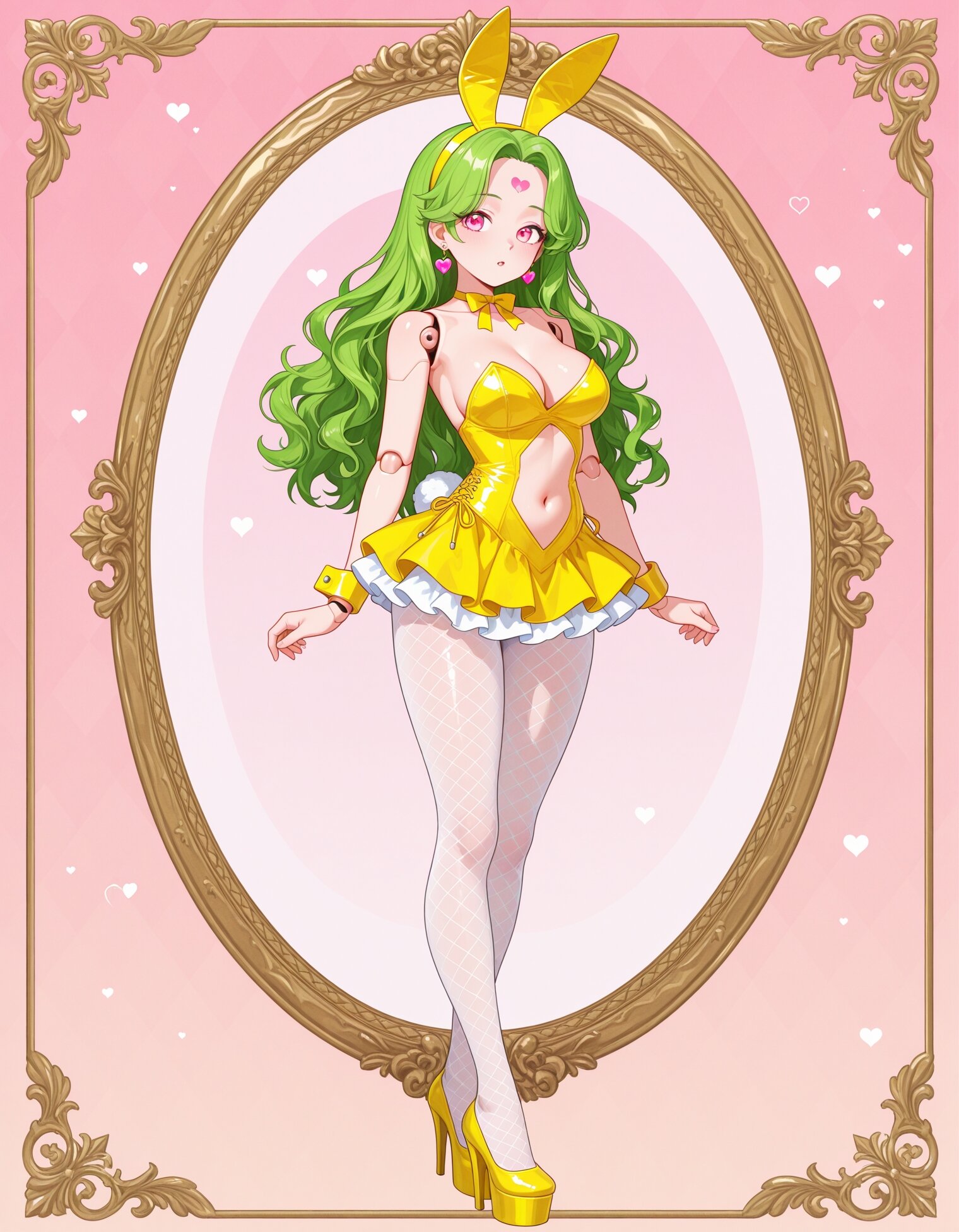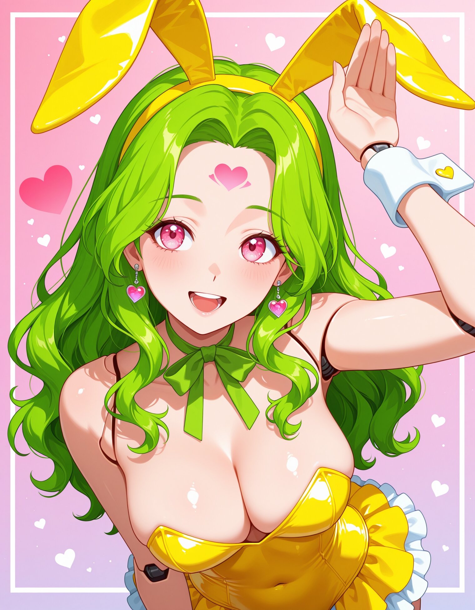 ⑦髪色はエムズ様のカラーであるライトグリーンを使用、額とピアスにハートでロゴのイメージを追加、目を引くように黄色いコスチュームを採用。腰のフリルで可愛さを追加。センターパートでお姉さん間も出してみました!